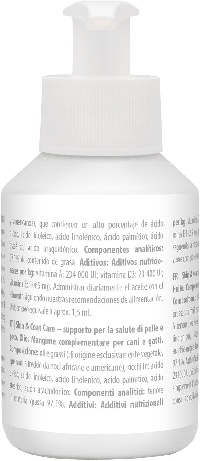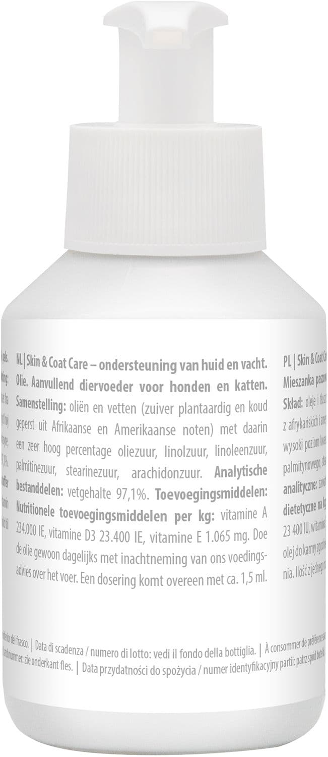 Skin & Coat Care verkürzt den Fellwechsel und regt den Haarwuchs an, sodass das Fell leicht zu pflegen ist und fantastisch glänzt. Erste Ergebnisse sind in der Regel nach den ersten 2 Wochen der täglichen Zufütterung sichtbar. Das Öl ist rein pflanzlich und kalt gepresst aus afrikanischen und amerikanischen Nüssen, mit einem idealen Verhältnis zwischen Omega-3- und Omega-6-Fettsäuren. Zusätzlich enthält das Öl Omega-7-Fettsäuren zur Regeneration der Haut und Omega-9-Fettsäuren für Herz und Kreislauf.
