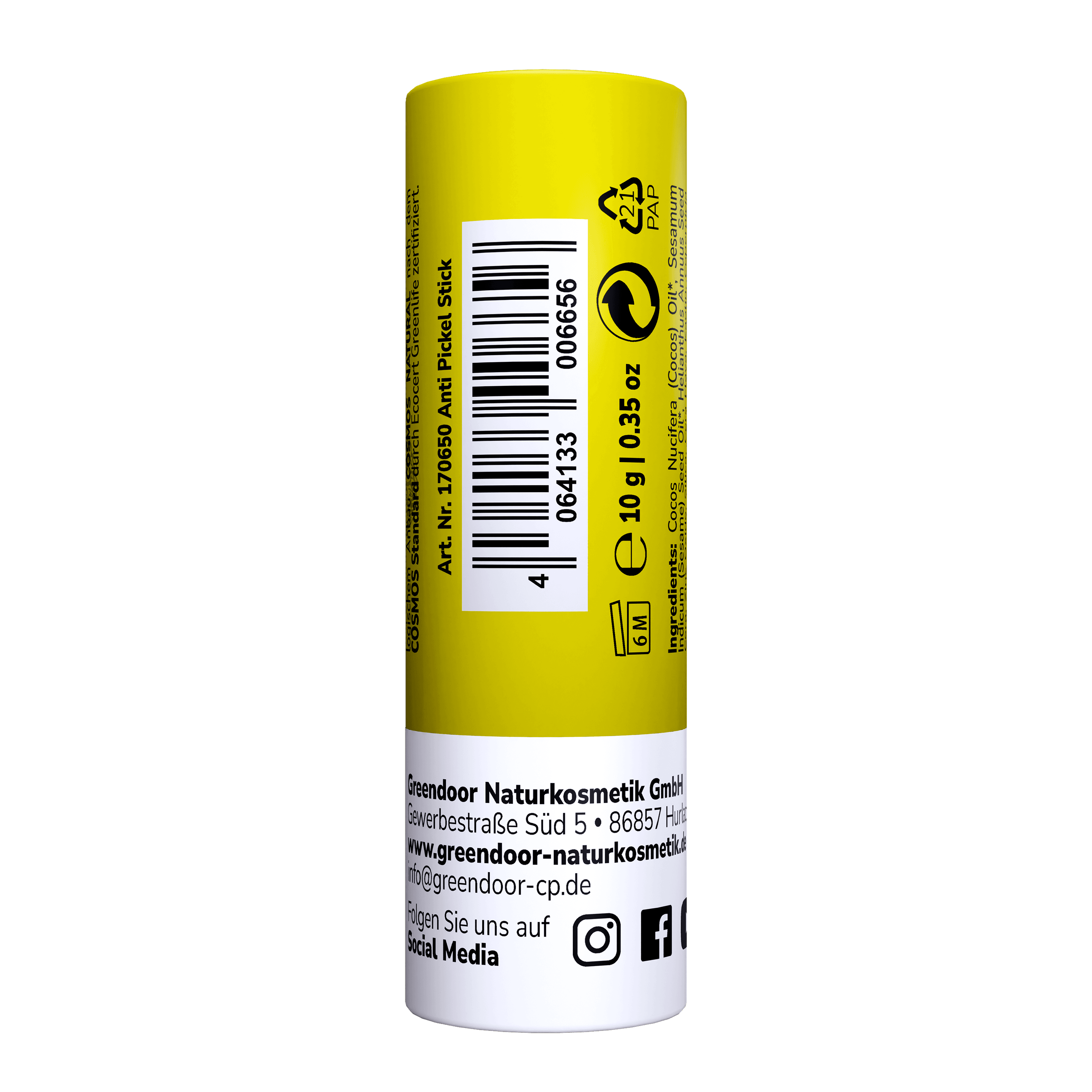 | Anwendungshinweis | Den Stick mit dem Zeigefinger knapp über den Rand schieben und das Produkt sanft über die zu behandelnde Stelle streichen. Ein ganz dünner Film reicht aus. Den Anti Pickel Stick nach der Anwendung mit seiner Verschlusskappe verschließen - die Kappe hat soviel Spiel, dass man den Stick nicht wieder zurückschieben muss. |