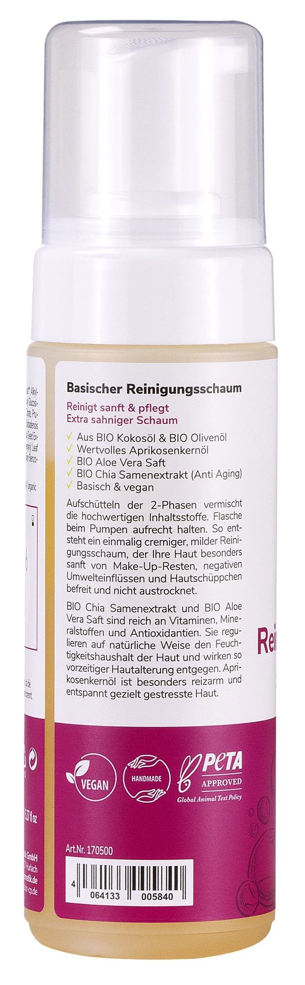 | Anwendungshinweis | 1. Reinigungsschaum schütteln, damit sich die zwei Phasen gut vermischen 2. Gesichtshaut leicht anfeuchten 3. Zwei bis drei Hübe des sanften Schaumes aus dem Foamer-Spender entnehmen 4. Schaum mit den Händen oder einer Gesichtsmassage Bürste sanft einmassieren 5. Mit lauwarmem Wasser abspülen und das Gesicht mit einem Tuch sanft trocken tupfen 6. Schaumreste vom Pumpenkopf entfernen und so ein Verkleben des Pumpmechanismuss verhindern |