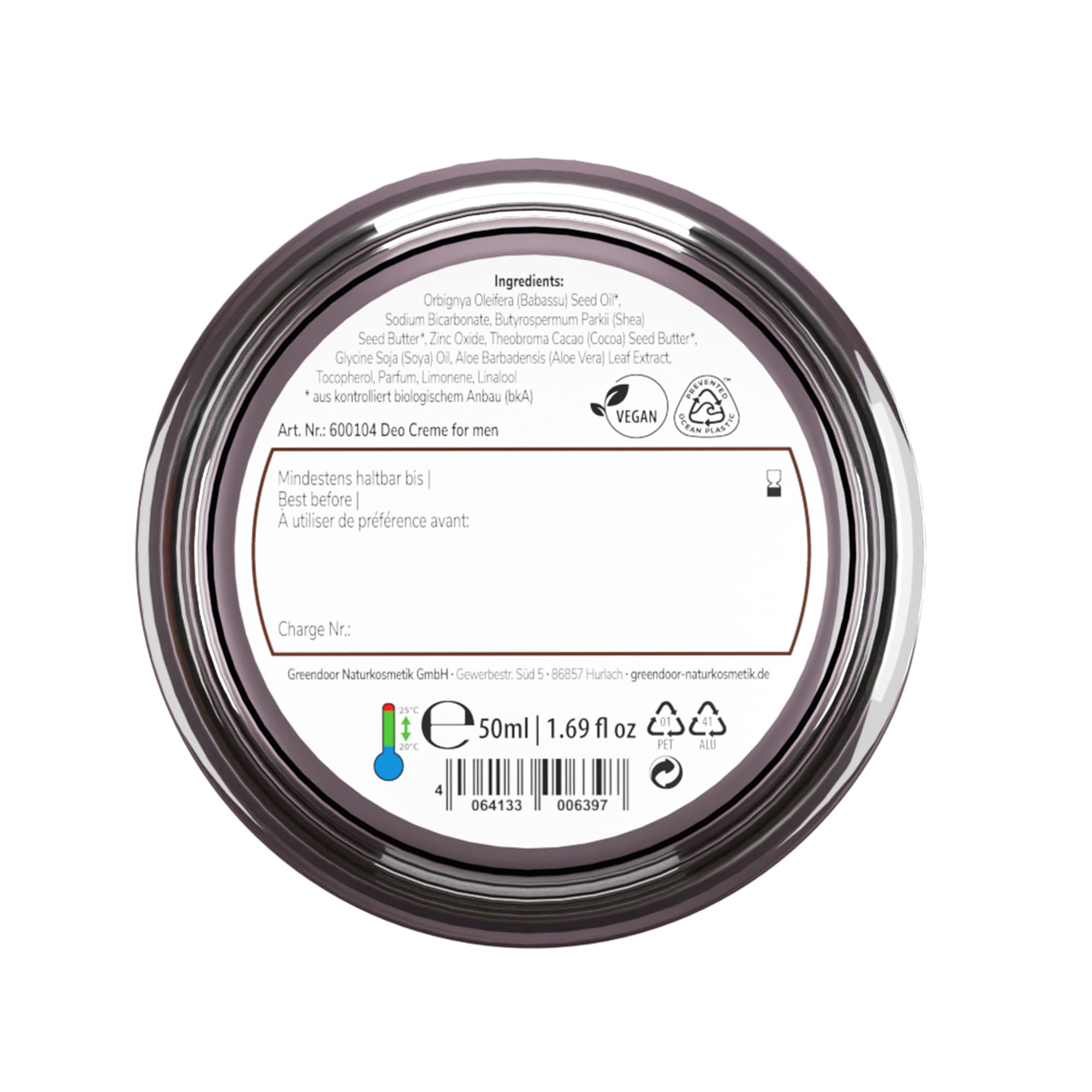 GREENDOOR Deo Creme for men ist aufgrund der speziellen Mischung aus perfekt aufeinander abgestimmten natürlichen Stoffen gleichzeitig wirksam und pflegend. Sie verhindert zuverlässig Schweißgeruch durch die natürliche antibakterielle GREENDOOR Formel. BIO Babassuöl, BIO Kakaobutter, BIO Shea Butter und Aloe Vera pflegen in diesem natürlichen Deo für Männer die Achselhaut. Ein einzigartiges, wirksames, natürliches Deo.