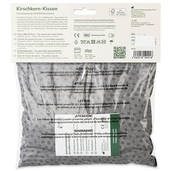 | Anwendungshinweis | Vor dem Erwärmen des Kissens auf untypischen Geruch, Stock- oder Brandflecken prüfen und bei Vorhandensein sofort entsorgen. Möglichkeiten zum Erwärmen: 100-00/112-00 Kirschkern-Kissen 16 x 16/19 x 19 cm 110-00/1100-00 Kirschkern-Kissen 22 x 24 cm/43 x 20 cm -im nicht vorgeheizten Backofen bei max. 110 °C für max. 5 Minuten erwärmen -in der Mikrowelle (Angaben des Mikrowellenherstellers beachten) bei max. 300 Watt für max. 1 Minute erwärmen bei max. 300 Watt für max. 2 Minuten erwärmen -längere Zeit auf einen handwarmen Heizkörper oder Kachelofen legen Direkt nach dem Erhitzen die Wärme durch Schütteln gleichmäßig im Kissen verteilen! Bei den ersten Erwärmungen kann es an der Oberfläche zu einer leichten Feuchtigkeitsbildung kommen, die aber bei wiederholten Anwendungen verschwindet. |