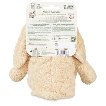 Die GRÜNSPECHT Wärme-Kuscheltiere laden durch ihr langes flauschiges Fell und ihre liebevoll gestaltete Art zum Kuscheln und Liebhaben ein. Als Spielkamerad oder Tröster bei kleinen Wehwehchen – die Wärme-Kuscheltiere sind vielseitig einsetzbar. Sie spenden wohltuende Wärme bei Bauchschmerzen/-krämpfen, Darmträgheit, Blähungen, Erkältung, kalten Füßchen oder einfach nur zum Kuscheln. Durch die vielseitigen Größen und Formen sind die Wärme-Kuscheltiere ein perfektes Geschenk für die ganze Familie, für Klein und Groß, Jung und Alt. Das Innenkissens ist aus 100 % Baumwolle. Durch das herausnehmbare Innenkissen lässt sich der Bezug einfach waschen. Wegen der möglichen allergenen Wirkung enthalten unsere Kuscheltiere keine allergieauslösenden Kräuter und Duftstoffe.Abmessung: 15 cm, Höhe: 35 cm ohne Ohren, Tiefe: 14 cm