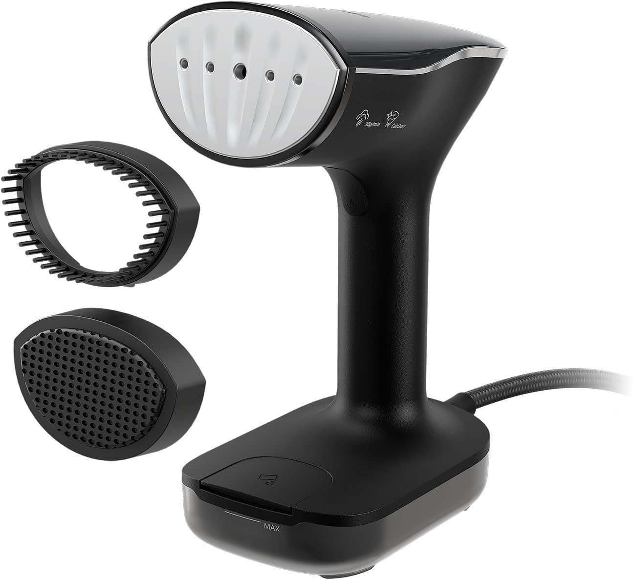 Die Dampfbürste ST 8450 ist dank leistungsstarker 2280 Watt superschnell betriebsbereit. Für schnelles Glätten zu Hause oder unterwegs ist sie mit 30g/Min. Dampf ideal und entfernt Falten schonend und effizient. Die keramikbeschichtete Heizplatte sorgt für dauerhaft reibungsfreies Gleiten. 2 Dampfeinstellungen (ECO/MAX) und Vertikaldampf für schnelles und schonendes Glätten. Sie können einfach über das benutzerfreundliche Display ausgewählt werden. Die Tropf-Stopp-Funktion verhindert Wasserflecken. Auto-Entkalkungsfunktion mit Calc-Guard. 200ml-Füllmenge reichen auch für längere Bügelphasen. 2 Meter Kabellänge für einen guten Handlingsradius. Umfangreiches Zubehör (Aufsteckbürsten für dicke/empfindliche Kleidungsstücke) und ein Hitzehandschuh machen diese Dampfbürste zu einem echten Allrounder.