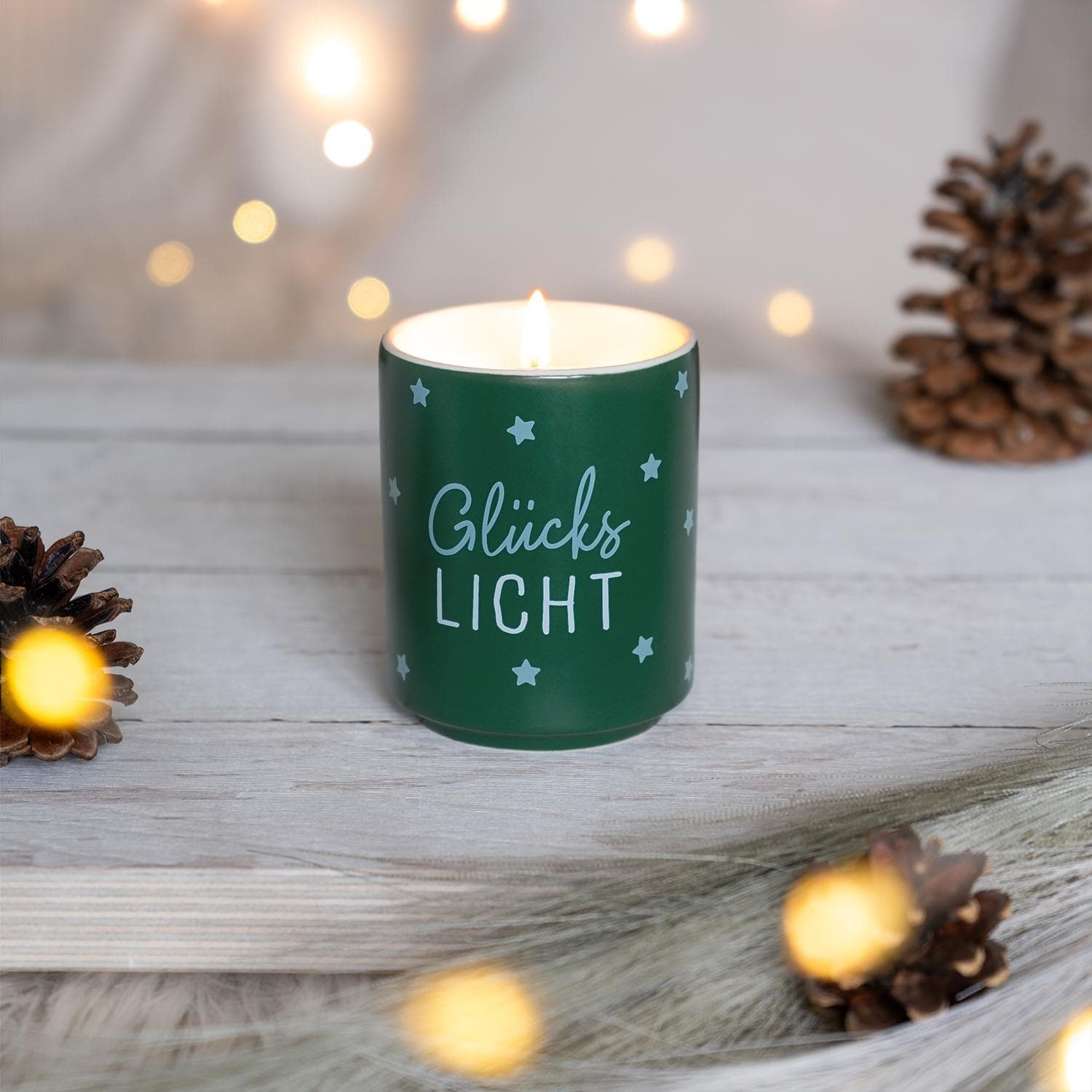 • Kerze im Porzellangefäß mit Motivdruck: »Glückslicht«