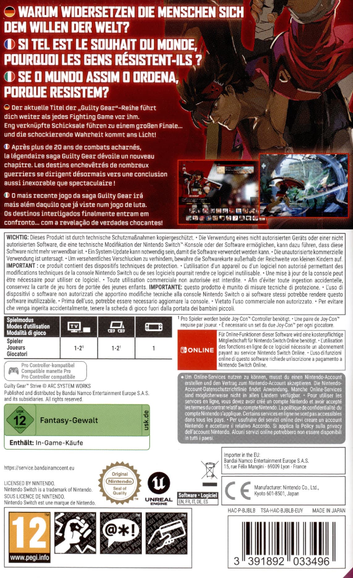 WARUM WIDERSETZEN DIE MENSCHEN SICH DME WILLEN DER WELT? Ein Spiel in der Guilty Gear-Reihe: speziell entworfen für alle Fans und Spieler von Fighting Games! Mit 3D-Visuals, die handgezeichneten Animes zum Verwechseln ähnlich sehen (2.5D) und die durch die gleichen hochwertigen Animationstechniken erzielt werden, welche bereits in der vielbeachteten Guilty Gear Xrd-Reihe zum Einsatz kamen. Die charismatischen Charaktere der Serie wurden komplett überarbeitet und mehrere neue Charaktere geben in diesem Spiel zusätzlich ihr Debüt. Das Gameplay wurde gegenüber den vorherigen Spielen weiter verbessert. Das Kampfsystem bleibt dabei im Kern weiterhin einfach zu verstehen, ohne dabei an Tiefgang zu verlieren für die Spieler, die es perfekt meistern wollen. Begleitet wird das Ganze erneut durch die Rockmusik von Daisuke Ishiwatari und einen Storymodus, der sogar über die übliche Spielfilmlänge hinausgeht und sowohl Guilty Gear-Fans also auch Anime-Enthusiasten begeistern wird. FEATURES: • Charismatische Hauptcharaktere. Das Design der bekannten Charaktere der Reihe wurde komplett überarbeitet. Außerdem wurden neue Charaktere hinzugefügt • Das Kampfsystem ist leicht zu verstehen und bietet gleichzeitig mehr Tiefgang denn je • Hintergrundmusik und Songs von Daisuke Ishiwatari begleiten die atemberaubenden Kämpfe. Die meisten Songs sind komplett neu • Komfortables Online-Spiel dank „Rollback Netcode“ • Mehrere verschiedene Spielmodi. Ein Storymodus, der über übliche Spielfilmlängen hinaus geht Die Guilty Gear -Strive- Nintendo Switch Edition enthält neben allen 28 Charakteren des Spiels, die aus dem Basisspiel sowie aus den 3 Season Passes stammen, auch den Rollback Netcode, der für flüssige und reibungslose Online-Kämpfe sorgt. Spielsprache Englisch & Japanisch, Bildschirmtexte Deutsch (Multilingual)