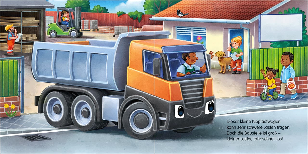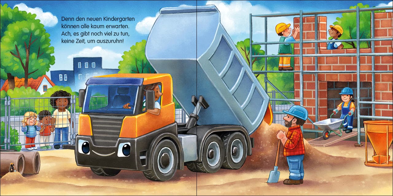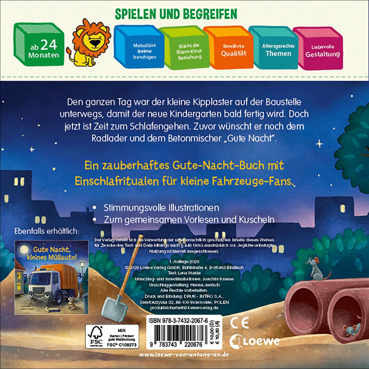 Loewe-Bücher: garantiert ohne KI Den ganzen Tag war der kleine Kipplaster auf der Baustelle unterwegs, damit der neue Kindergarten bald fertig wird. Doch jetzt ist Zeit zum Schlafengehen. Zuvor wünscht er noch dem Radlader und dem Betonmischer „Gute Nacht“.
