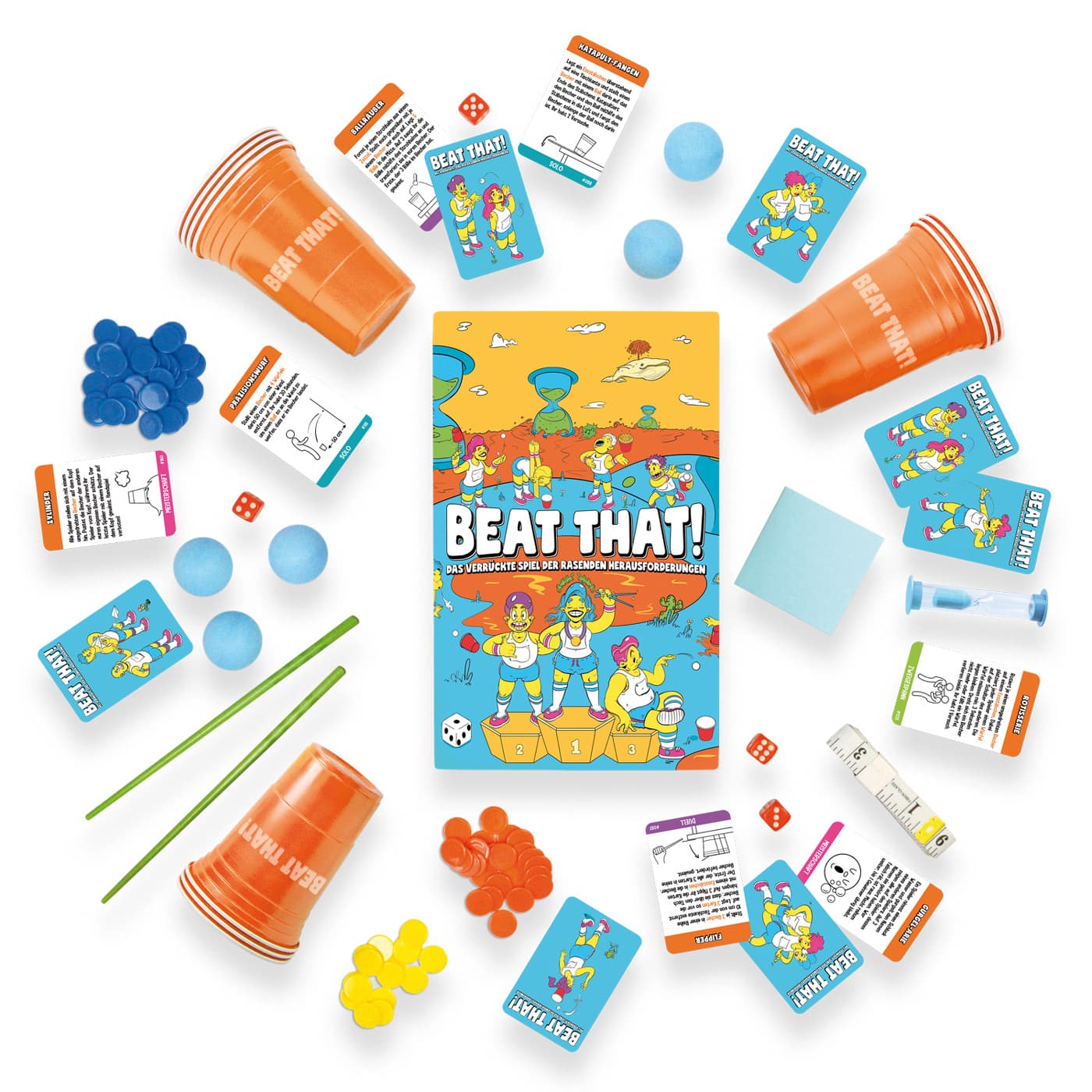 Das verrückte Spiel der rasenden Herausforderungen! Macht euch schon mal locker, denn jetzt müsst ihr werfen, kippen, stapeln, schnipsen, hüpfen, pusten, balancieren und katapultieren, um das verrückteste Partyspiel der Welt zu gewinnen! Ziel ist, möglichst viele Punkte zu sammeln, indem ihr darauf wettet, mithilfe verschiedener, anscheinend beliebiger Gegenstände eine Reihe irrwitziger Herausforderungen zu bestehen. Macht euch für den ultimativen Wettkampf bereit, denn alle Spieler messen ihr Können an den gleichen Herausforderungen! Dieses schnelle, lustige Partyspiel ist sowohl für Kinder als auch Erwachsene ideal und garantiert Lachkrämpe ohne Ende!