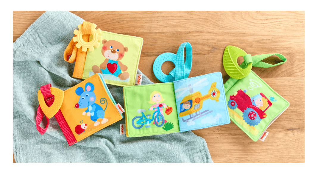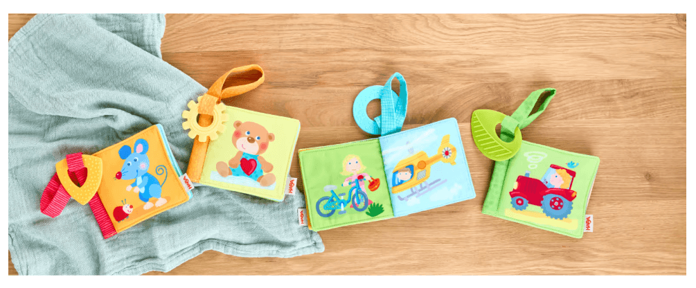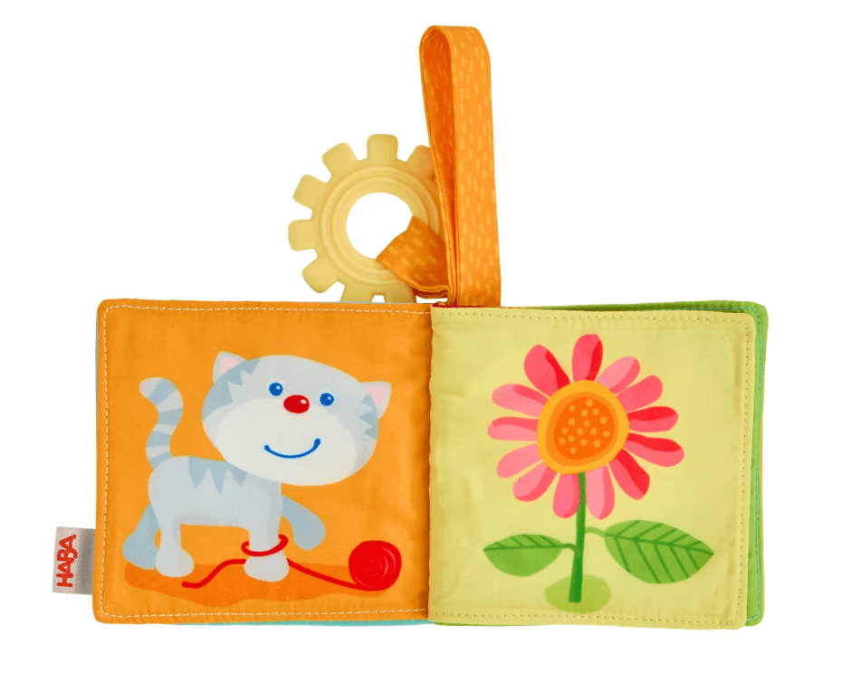 Erste Wörter lernen leicht gemacht! Auf den weichen, robusten Seiten des HABA Buggybuchs Erste Wörter warten lustige Gegenstände, niedliche Tierchen und akustische Effekte darauf, von Babys ausgiebig entdeckt und erkundet zu werden. Bär, Ball, Blume & Co – bei Wiederholung der Wörter verinnerlichen Babys die Bezeichnungen und lernen schnell dazu. Per Klettschlaufe lässt sich das Buggybuch kinderleicht an Buggy, Babyschale und Bettchen befestigen und auch überall mithinnehmen. Praktisch: Das an der Klettschlaufe befestigte Beißelement hilft beim Zahnen. Ein spannender erster Begleiter für Babys, die erste Berührungen mit der Bücherwelt machen möchten!