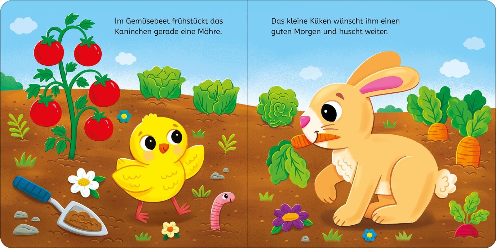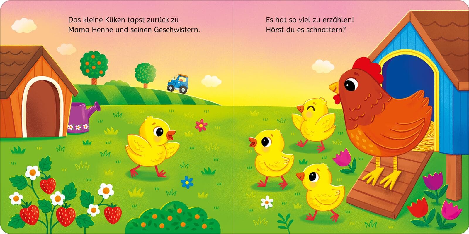 Nanu, wer ist denn da so früh aufgewacht? Es ist das kleine Küken, das sich neugierig aufmacht, um all seine tierischen Freunden auf dem Bauernhof zu begrüßen. Bei den Schweinen lässt es sich so schön im Matsch spielen und mit den Schafen kann man um die Wette laufen. Aber am schönsten ist es bei Mama Henne und den Geschwistern!
