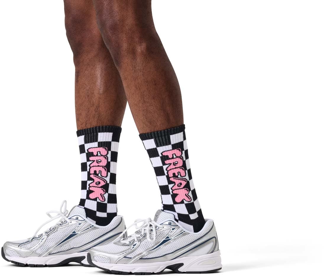 Lass den Rebellen raus – mit unserer Freak Check Sneaker Socke! Schwarz-weiß kariert, extrem auffällig und mit einem frechen „freak“-Statement am Bund, das jedem Outfit ordentlich Persönlichkeit verpasst. Ob beim Sport, auf dem Bolzplatz oder einfach unterwegs: Diese Socken zeigen, dass du deinen eigenen Style hast – und dazu stehst. Der Klassiker in neuem Look, perfekt für alle, die lieber auffallen als mitlaufen.