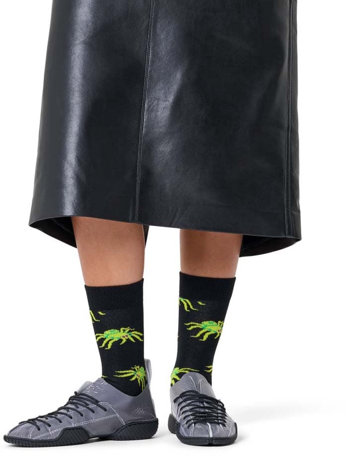 Verspielte Spinnensocken mit einem sich wiederholenden Spinnenmuster auf leuchtend gelbem Hintergrund. Shoppe jetzt und bring gruselig-krabbelnden Spaß in dein Outfit.