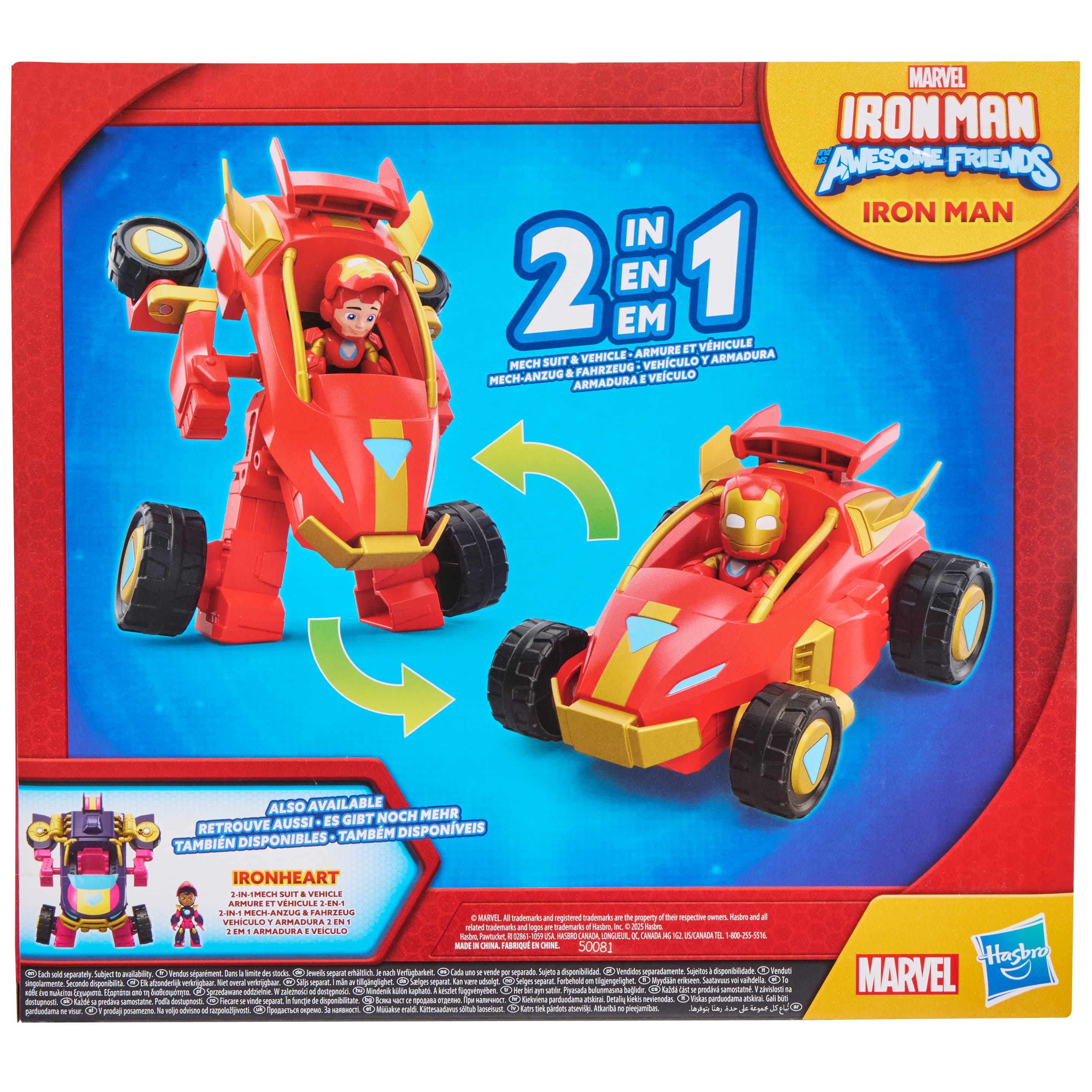 Mit einem 2-in-1 Mech-Anzug & Fahrzeug Action-Figurenset können sich Kinder dem Team Iron Man bei seinem neuesten Abenteuer anschließen! Die Spielzeugautos kommen mit enthaltenen und 7,6 cm großen Action-Figuren, deren Held sich enthüllen lässt. Einfach die Maske hochklappen, und schon werden ihre Gesichter offenbart. Wird sie wieder heruntergeklappt, kann sich der Held gerüstet ins Abenteuer stürzen! Die Spielzeuge lassen sich in 3 bis 4 einfachen Schritten vom Mech-Anzug in ein Fahrzeug oder vom Fahrzeug in den Mech-Anzug verwandeln. Sogar während der Verwandlung können die Figuren im Inneren sitzen bleiben! Dieses Marvel Spielzeug für Jungen und Mädchen bietet fantasievollen und abenteuerlichen Spielspaß für Kinder ab 3 Jahren. Es gibt noch mehr Iron Man and His Awesome Friends Spielzeuge, Spielsets und Action-Figuren mit Accessoires, um eine Superhelden-Sammlung zu erschaffen oder sie als coole Marvel Geschenke an Vorschüler zu verschenken. (Jeweils separat erhältlich. Je nach Verfügbarkeit.) Copyright MARVEL. Alle Marken und eingetragenen Marken sind Eigentum ihrer jeweiligen Inhaber. HASBRO und alle damit verbundenen Marken und Logos sind Marken von Hasbro, Inc.
