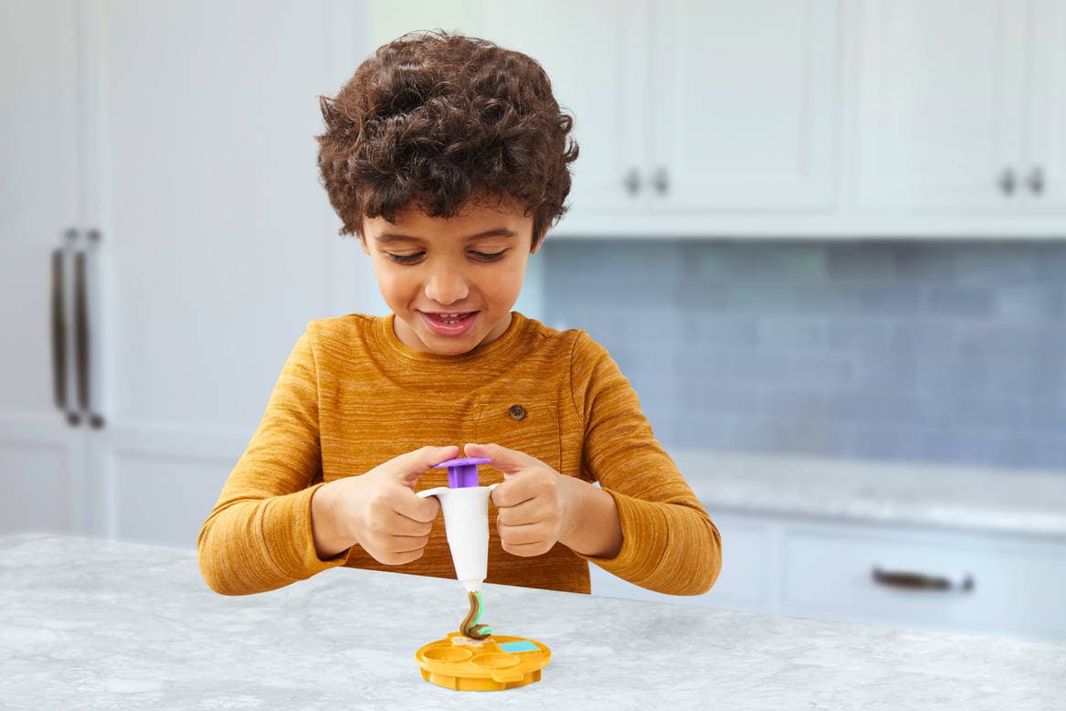 Mit der Super Küchenmaschine aus der Play-Doh Knetküche können Kinder fantasievolle Kuchen, Cupcakes oder Plätzchen aus Knete zaubern. Kleine Konditoren können sich richtig ins Zeug legen, indem sie einen der 2 Aufsätze in die abnehmbare Schüssel einsetzen und jede Form mit Play-Doh Spielknete füllen und dann ganz einfach den Hebel bewegen, um lustige Plätzchen und tolle Kuchenformen zu stempeln. Mit der Knetspritze lassen sich die Knetkreationen dekorieren und mit den Löchern am Griff des Teigschabers entstehen Streusel zum Verzieren. Die Förmchen an der Seite der Küchenmaschine können verwendet werden, um Bonbons, Toppings und noch mehr Dekorationen aus Play-Doh zu kreieren. Dieses Play-Doh Spielset enthält 284 g Spielknete in verschiedenen Farben und eignet sich prima als Beschäftigung oder als Geschenk für Kinder ab 3 Jahren, die gerne kneten und mit Küchenspielzeug spielen. Hasbro, Play-Doh sowie alle dazugehörigen Merkmale sind Marken von Hasbro.