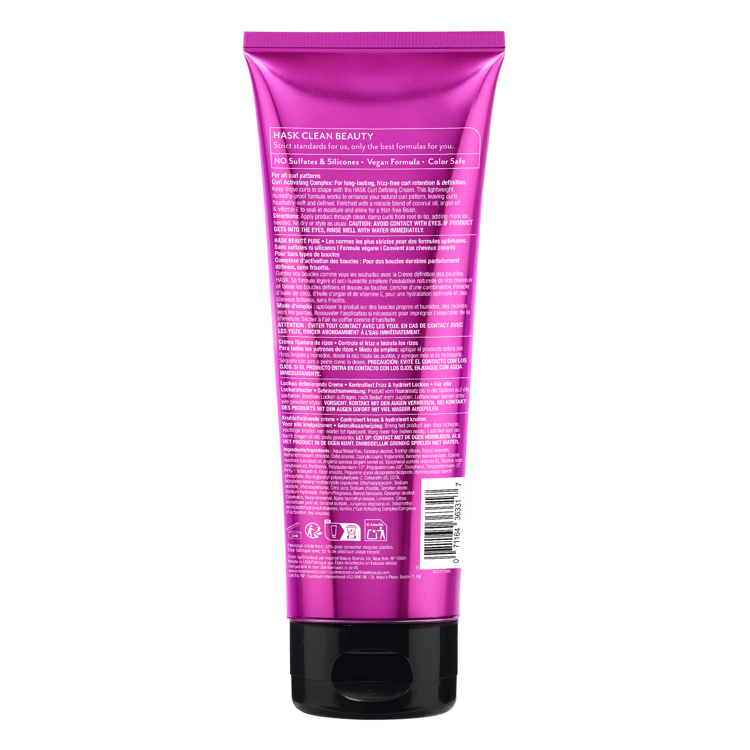 | Inhaltsstoffe | Aqua/Water/Eau, Cetearyl alcohol, Triethyl citrate, Glycol stearate, Behentrimonium chloride, Cetyl alcohol, Caprylic/capric triglyceride, Isononyl isononanoate, Cocos nucifera (coconut) oil, Argania spinosa (argan) kernel oil, Tocopheryl acetate (vitamin E), Glycine soja (soybean) oil, Panthenol, Polyquaternium-10*, PG-Hydroxyethylcellulose cocodimonium chloride*, Polyquaternium-68, Tocopherol, Polyquaternium-37, PPG-1 trideceth-6, Oleyl erucate, Propylene glycol dicaprylate/dicaprate, Hydroxypropyl starch phosphate, Bis-diglyceryl polyacyladipate-2, Ceteareth-20, EDTA, Acrylates/stearyl methacrylate copolymer, Ethylhexylglycerin, Phenoxyethanol, Citric acid, Sorbitan oleate, Sodium hydroxide, Parfum/Fragrance, Benzyl benzoate, Cinnamyl alcohol, Coumarin, Hexyl cinnamal (*Curl Activating Complex/Complexe d’activation des boucles). |