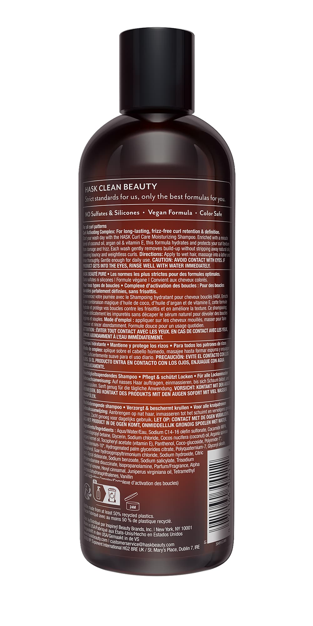 Das Hask Curl Care Shampoo reinigt das Haar und versorgt es mit der nötigen Feuchtigkeit. Angereichert mit einer Mischung aus Kokosöl, Arganöl und Vitamin E hydratisiert es das Haar und schützt die Lockenstruktur. Bändigt krauses und widerspenstiges Haar und hilft, die Locken in Form zu halten. Verbessert die Kämmbarkeit von lockigem, störrischem Haar und schützt wirksam gegen Haarbruch. Frei von Silikonen, Sulfaten und Alkohol, vegan und tierversuchsfrei.