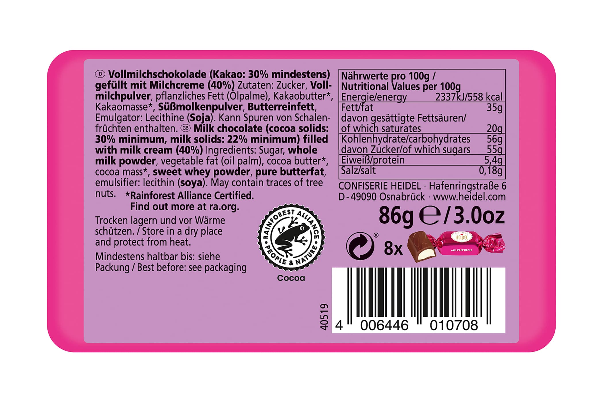 | Zutaten | Zucker, VOLLMILCHPULVER, pflanzliches Fett (Ölpalme), Kakaobutter, Kakaomasse, SÜßMOLKENPULVER, BUTTERREINFETT, Emulgator: LECITHINE (SOJA) |