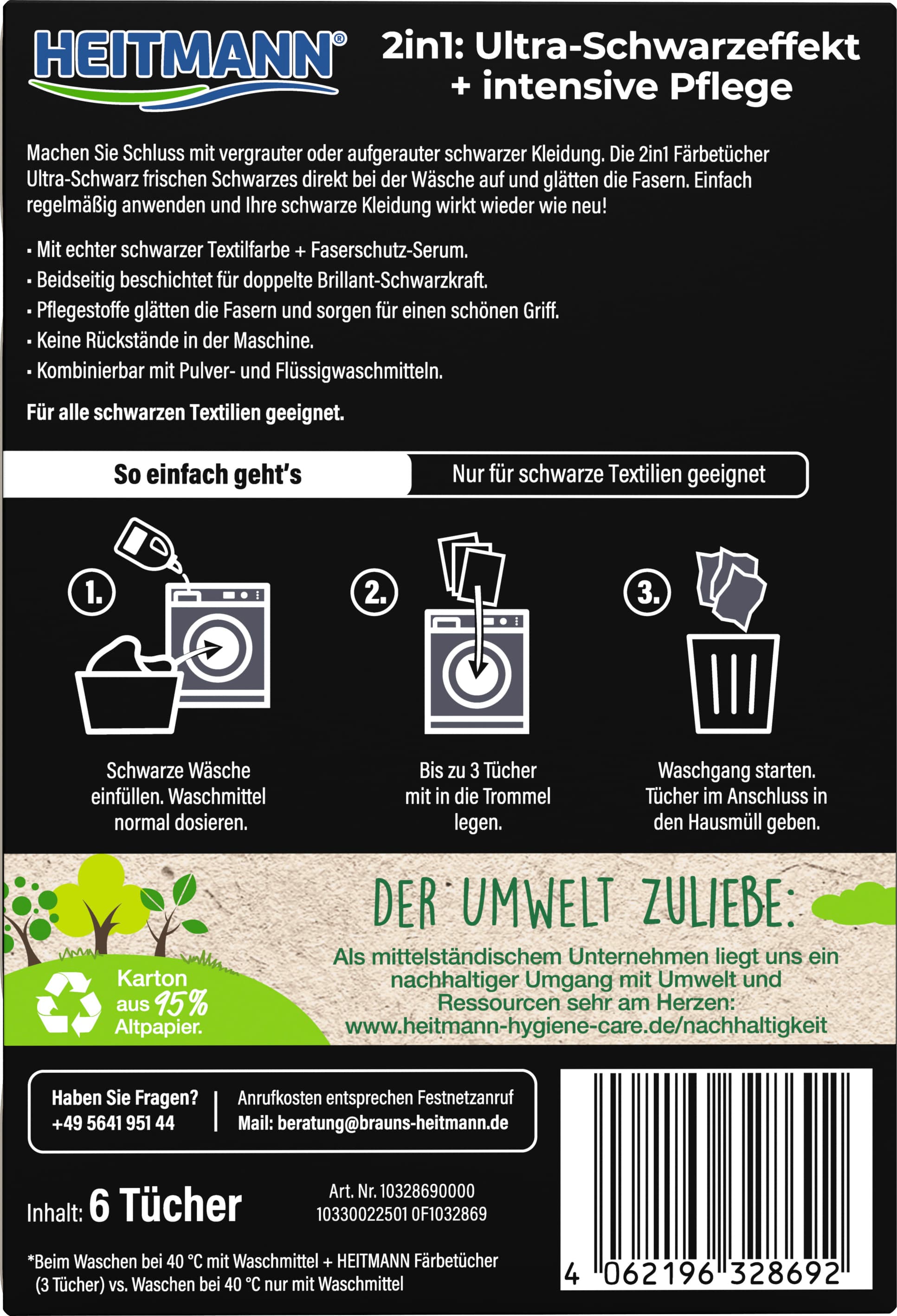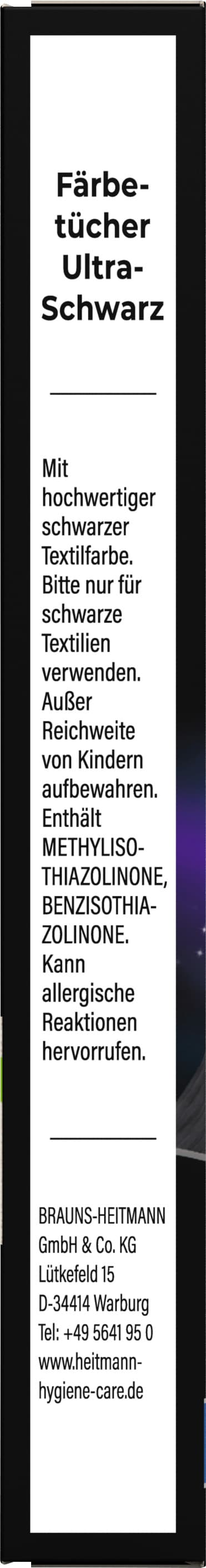 | Anwendungshinweis | Mit echter schwarzer Textilfarbe + Faserschutz-Serum. Beidseitig beschichtet für doppelte Brillant-Schwarzkraft. Pflegestoffe glätten die Fasern und sorgen für einen schönen Griff. Keine Rückstände in der Maschine. Kombinierbar mit Pulver- und Flüssigwaschmitteln. Für alle schwarzen Textilien geeignet. Nur für schwarze Textilien geeignet. So einfach geht's: 1. Schwarze Wäsche einfüllen. Waschmittel normal dosieren. 2. Bis zu 3 Tücher mit in die Trommel legen. 3. Waschgang starten. Tücher im Anschluss in den Hausmüll geben. Mit hochwertiger schwarzer Textilfarbe. Bitte nur für schwarze Textilien verwenden. |