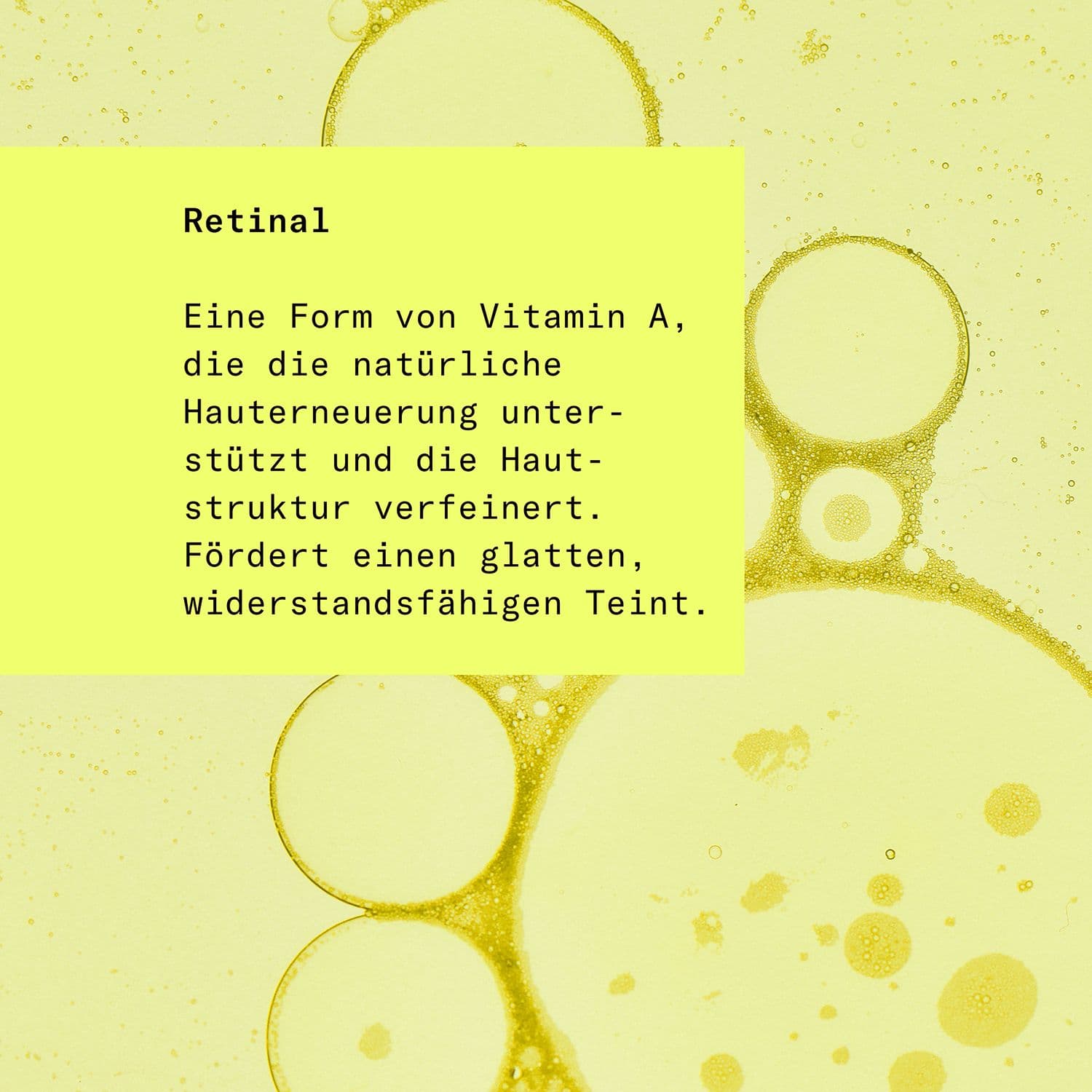 | Inhaltsstoffe | Aqua, Rosa Damascena Flower Water, Caprylic/Capric Triglyceride, Glycerin, Simmondsia Chinensis Seed Oil, Lactococcus Ferment Lysate, Maltodextrin, Glyceryl Citrate/Lactate/Linoleate/Oleate, Microcrystalline Cellulose, Aloe Barbadensis Leaf Juice Powder, Pyrus Malus Fruit Extract, Helianthus Annuus Sprout Extract, Lactobacillus Ferment, Alteromonas Ferment Extract, Retinal, Tocopherol, Phospholipids, Phosphatidylcholine, Magnesium PCA, Mannitol, Cetyl Alcohol, Polyglyceryl-10 Laurate, Pentylene Glycol, Xanthan Gum, Citric Acid, Sodium Chloride, Sodium Hydroxide, 1,2-Hexanediol, Phenethyl Alcohol, Phenylpropanol, Sodium Benzoate, Sodium Levulinate, Levulinic Acid, Potassium Sorbate, Lactic Acid, Parfum |