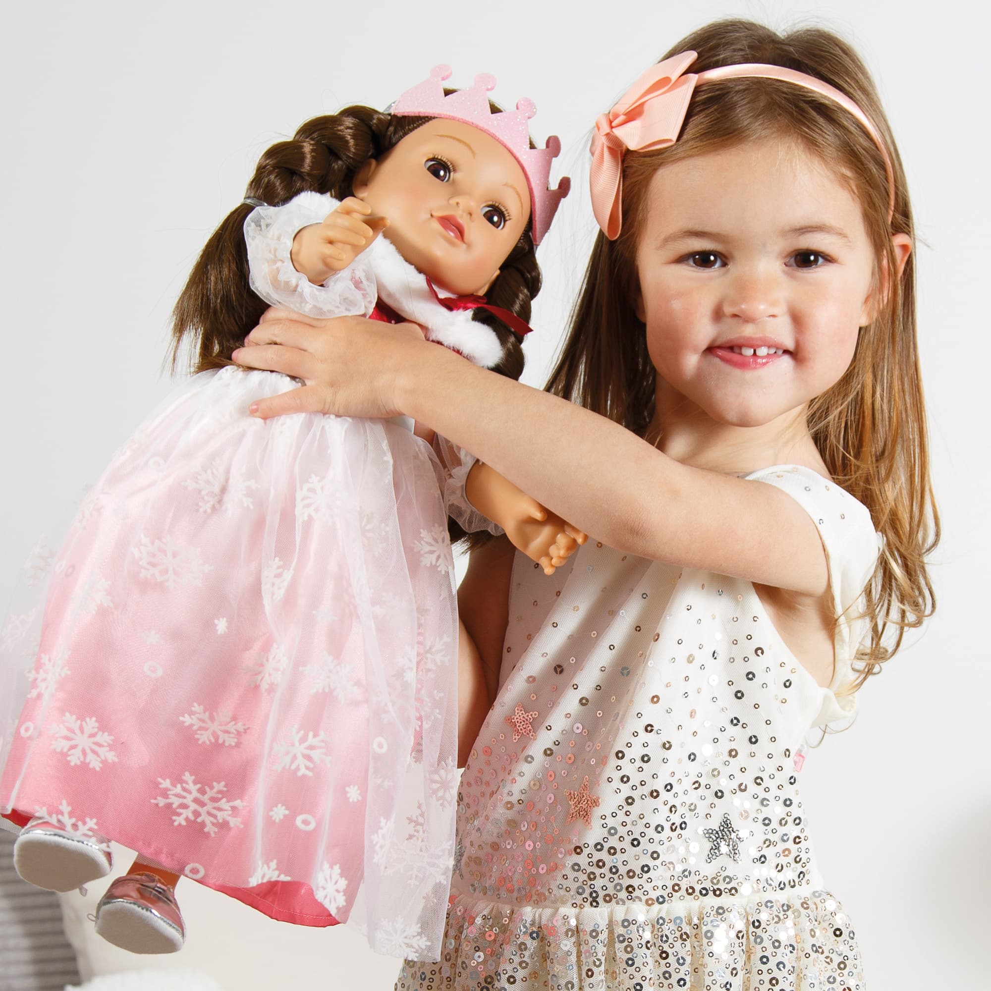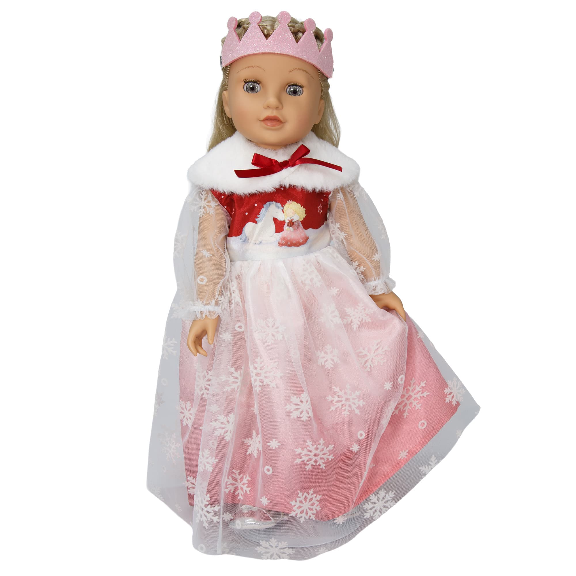Winterlicher Märchenzauber: Das Outfit verwandelt Puppen in hinreißende Königinnen. Das Kleid besticht durch seinen schimmernden Stoff, elegante Tüllärmel und glitzernde Schneeflocken auf dem Rock.