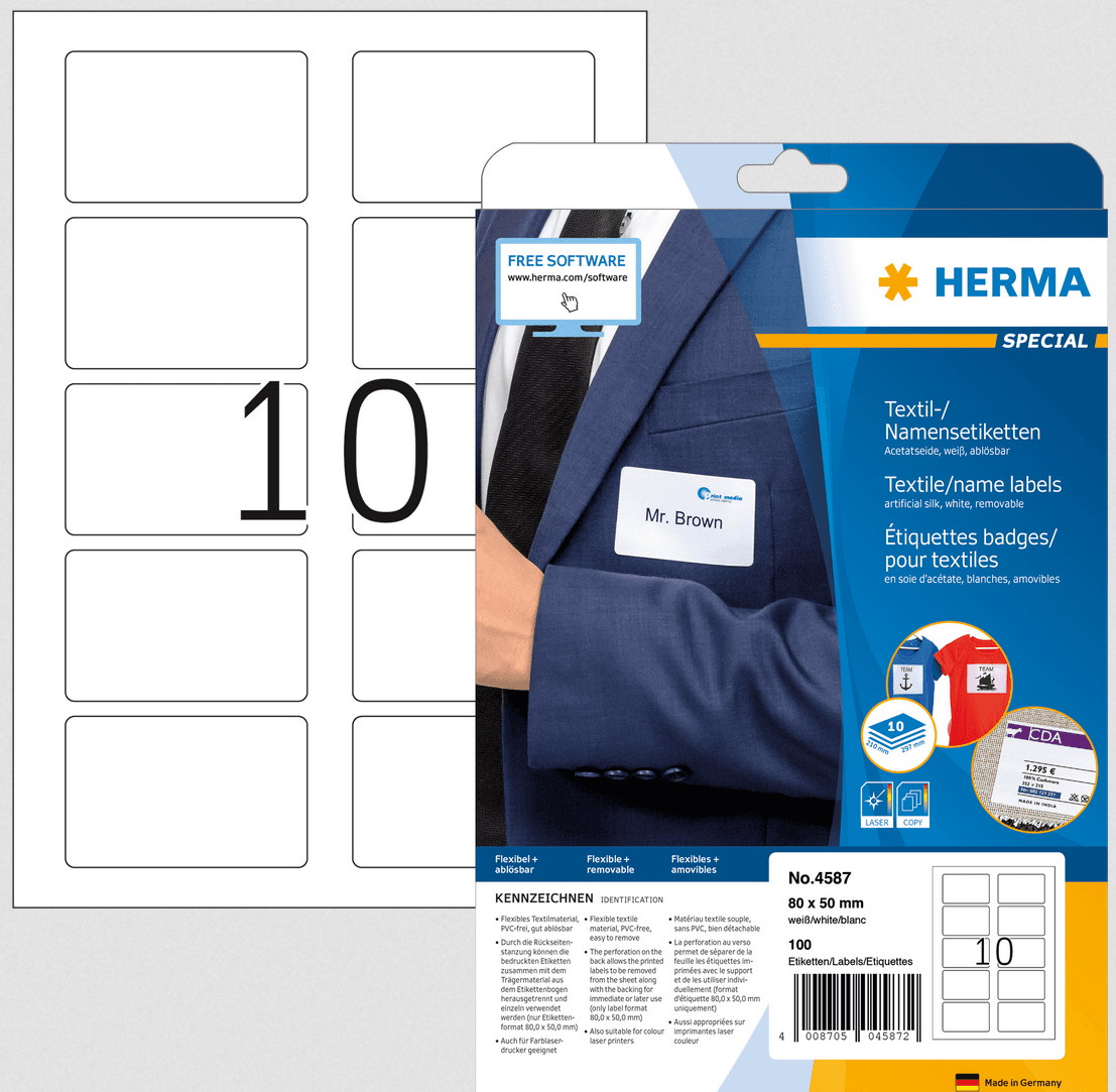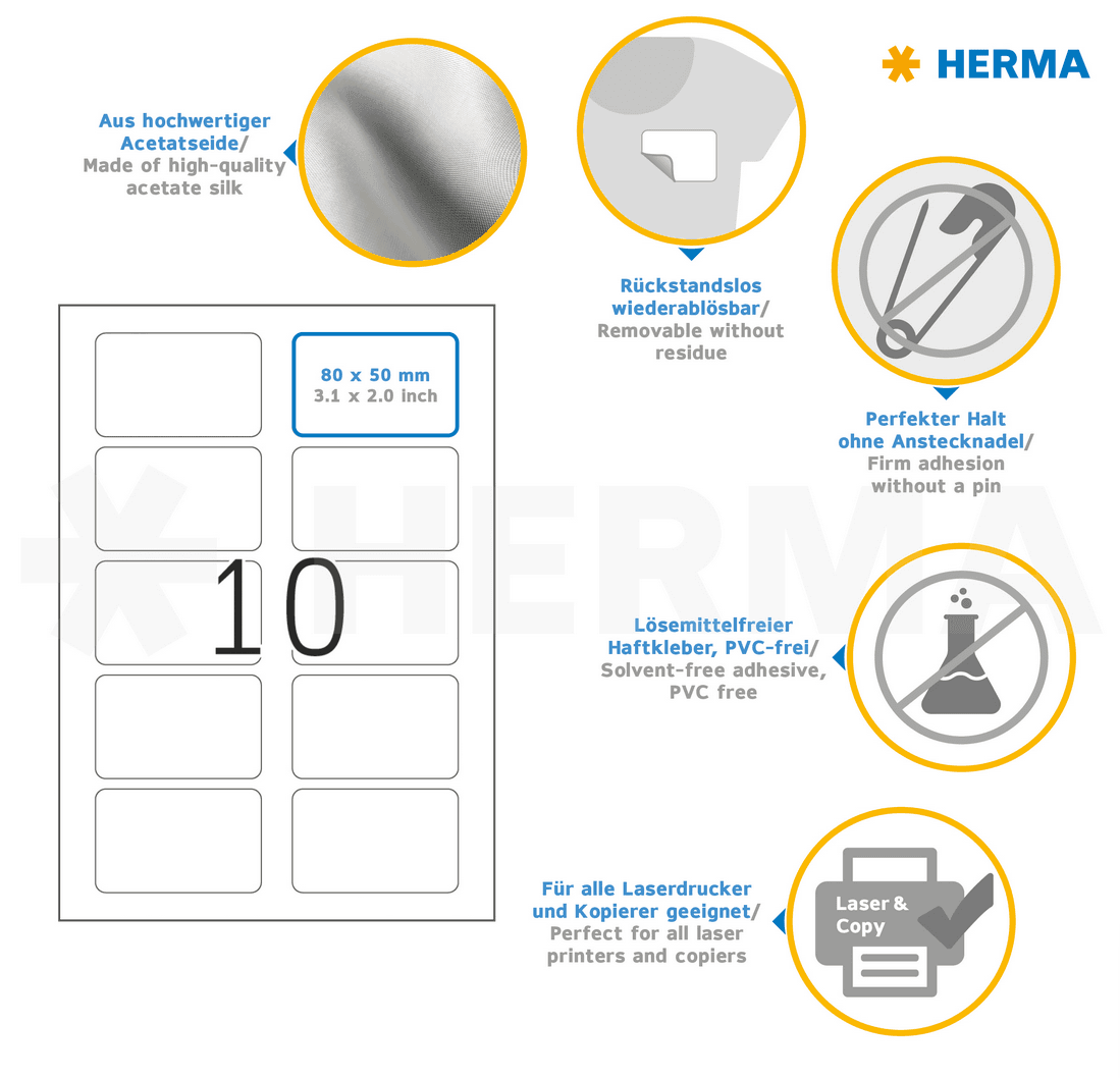 Etiketten aus Acetatseide, auf A4-Blättern, selbstklebend. Ideal geeignet für Seminare, Konferenzen, Messen, oder zur Kennzeichnung von Stoffen, Teppichen und Matratzen. Praktische Alternative zu Plastikschildern: schnell beschriftet, perfekter Halt ohne Anstecknadel. Flexibles Textilmaterial, sicher haftend, gut ablösbar. Achtung: nicht auf Feinleder oder feine Textilien, z. B. Seide oder Samt kleben. Für Laserdrucker, Kopierer, Farblaserdrucker und Farbkopierer. Nicht für Inkjetdrucker geeignet. Kostenlose Softwarelösungen: www.herma.de/software.