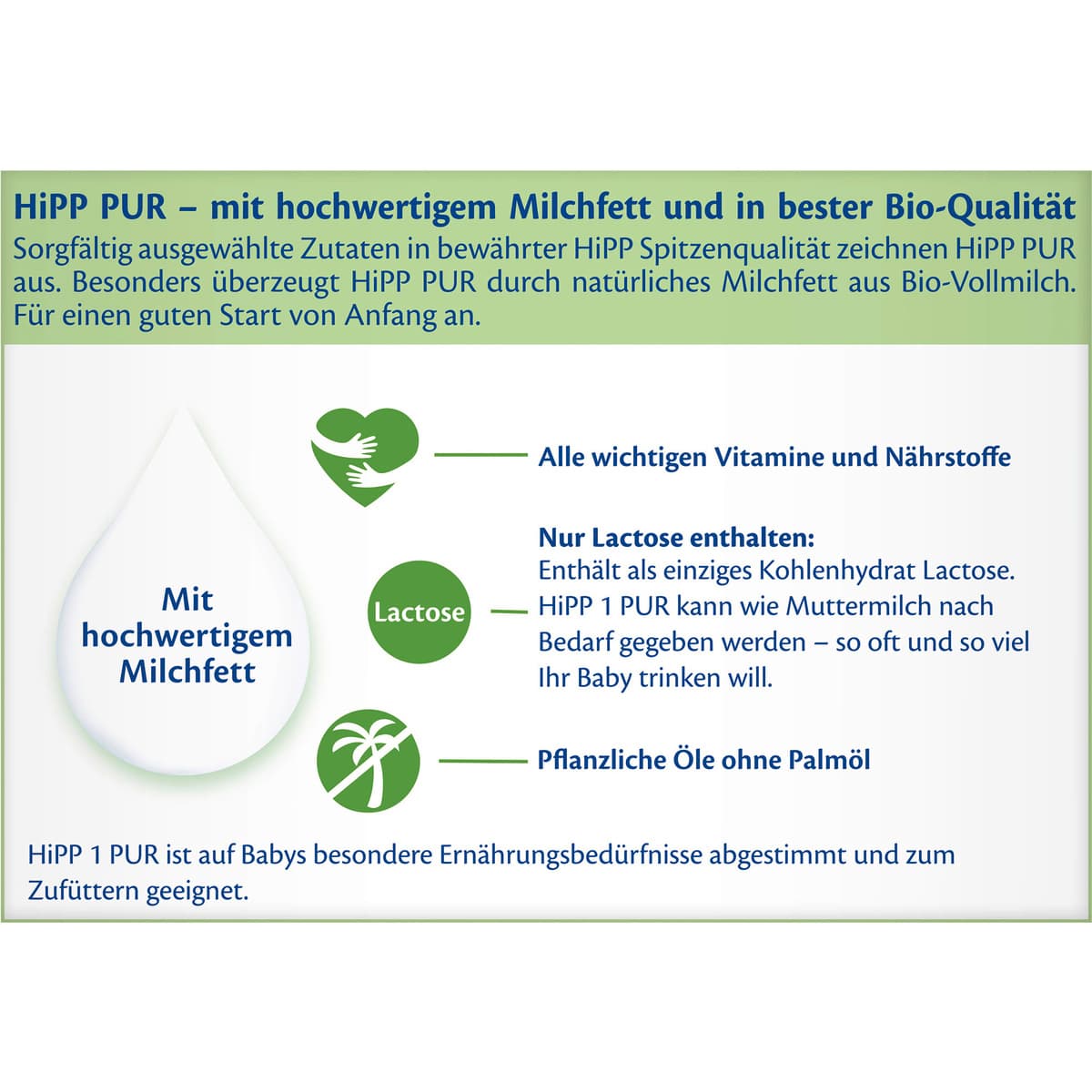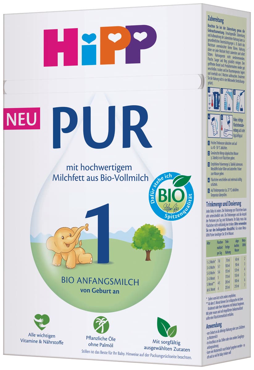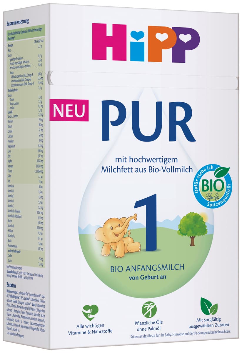 Unsere neue HiPP PUR - mit hochwertigem Milchfett und in bester Bio-Qualität. Sorgfältig ausgewählte Zutaten in bewährter HiPP Spitzenqualität zeichnen HiPP PUR aus. Überzeugt besonders durch natürliches Milchfett aus Bio-Vollmilch. Für einen guten Start von Anfang an. HiPP hat über 60 Jahre sorgfältige Erfahrung mit Milchnahrungen – nach den neuesten Erkenntnissen der Muttermilchforschung. Die hohen HiPP Qualitätsanforderungen gehen bei der Auswahl der Rohstoffe deutlich über die Anforderungen des Gesetzgebers hinaus. Strengste Qualitätskontrollen vom Rohstoff bis zum Endprodukt garantieren größtmögliche Sicherheit für Sie und Ihr Baby.