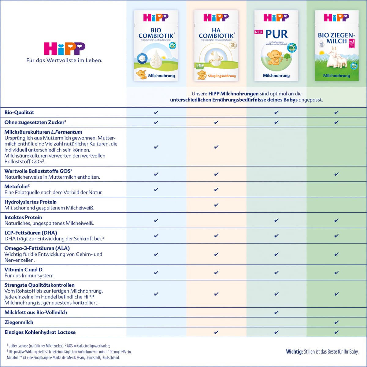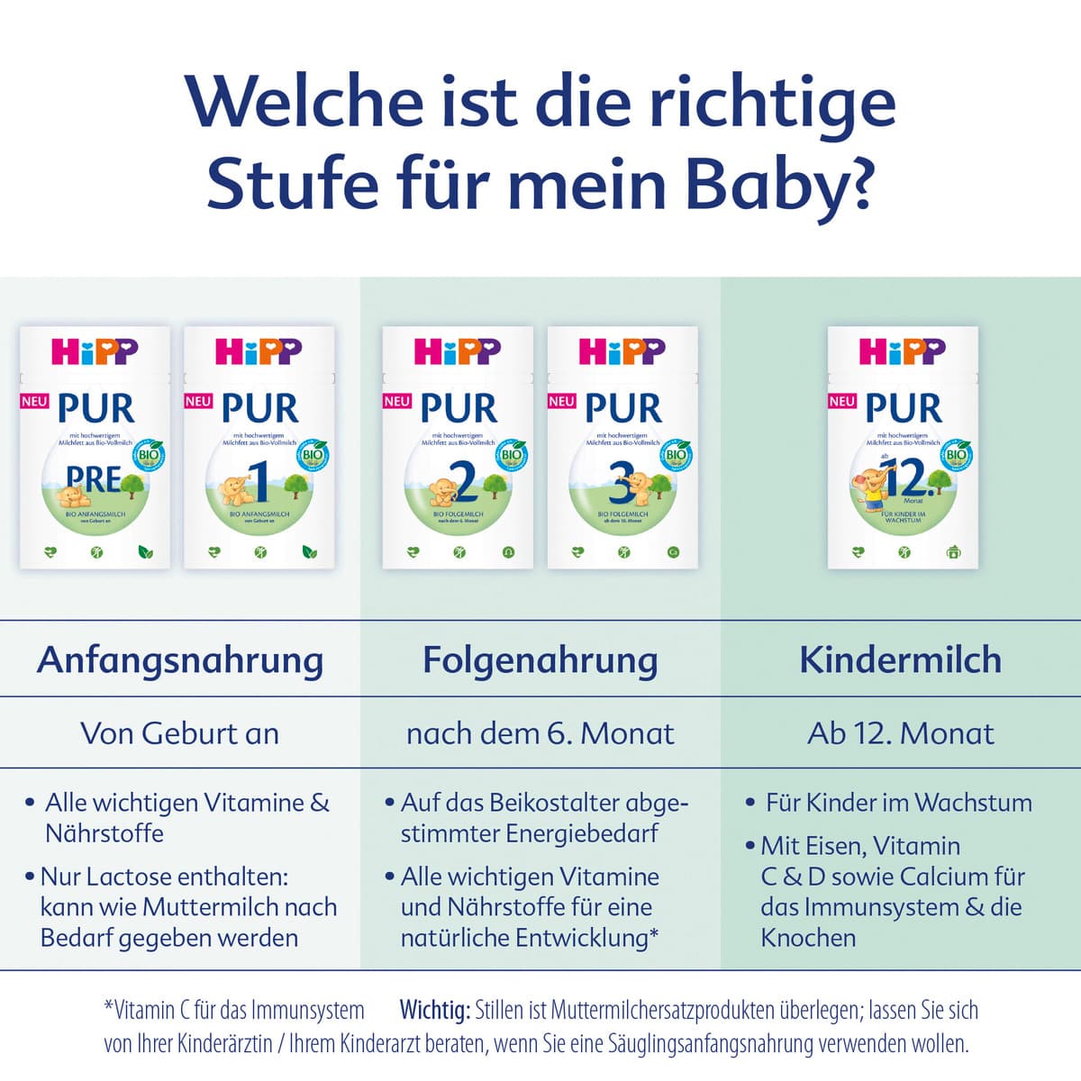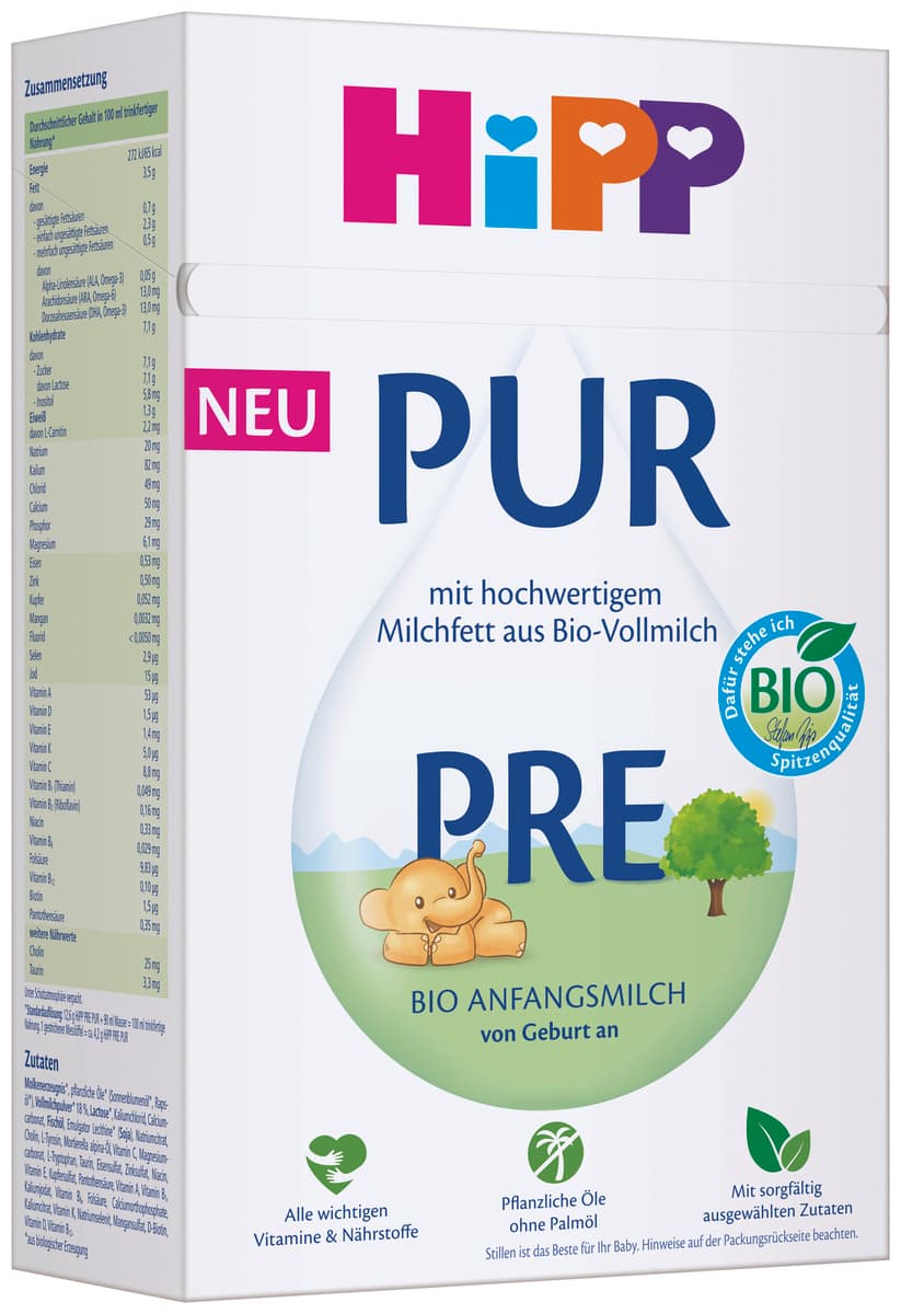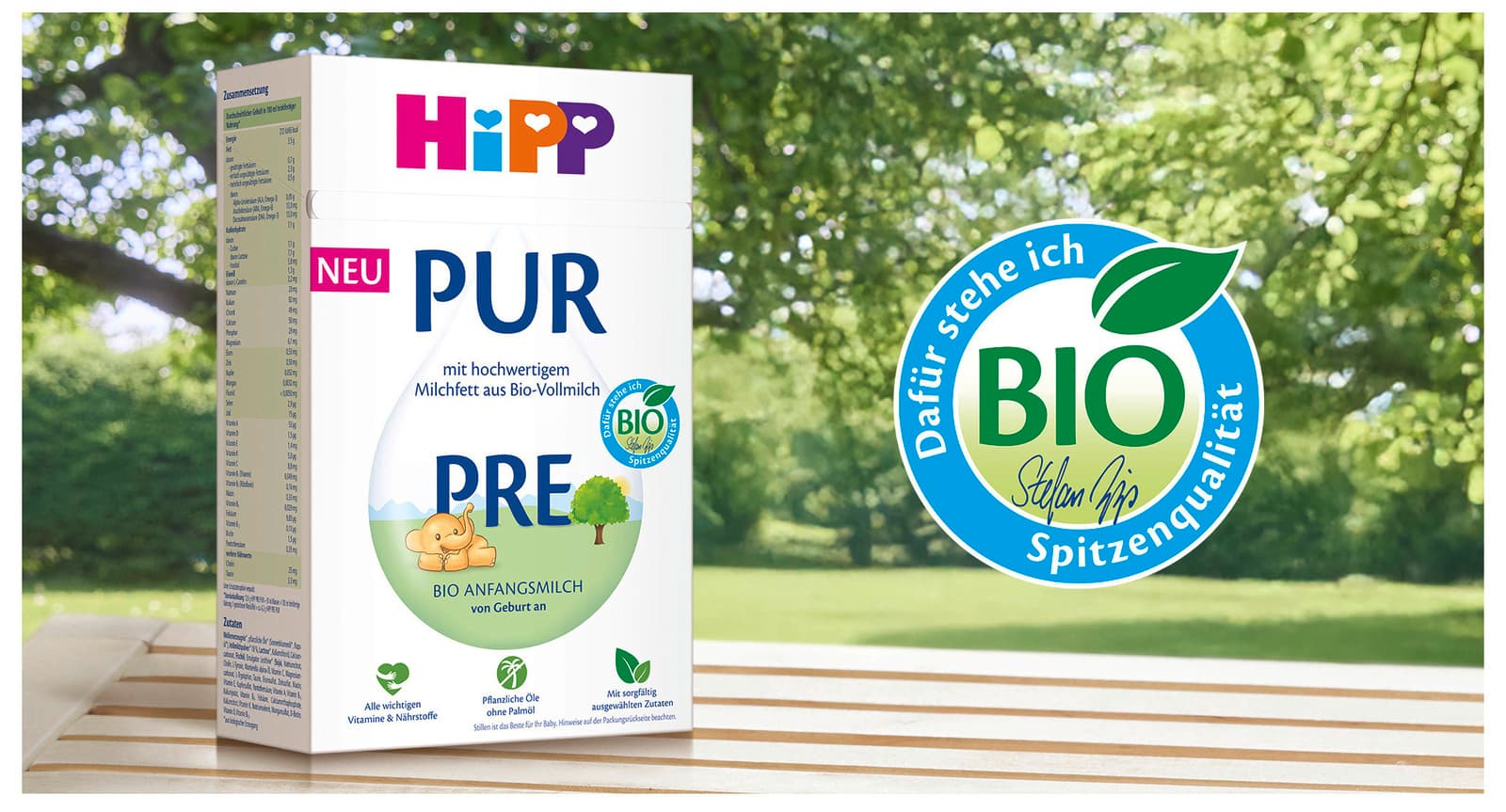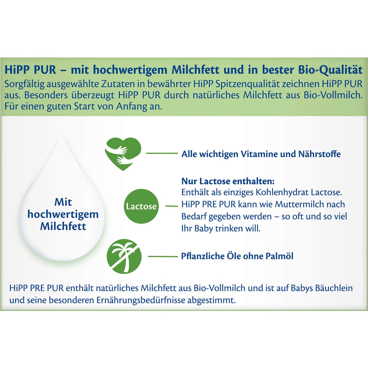 Unsere neue HiPP PUR - mit hochwertigem Milchfett und in bester Bio-Qualität. Sorgfältig ausgewählte Zutaten in bewährter HiPP Spitzenqualität zeichnen HiPP PUR aus. Überzeugt besonders durch natürliches Milchfett aus Bio-Vollmilch. Für einen guten Start von Anfang an. HiPP hat über 60 Jahre sorgfältige Erfahrung mit Milchnahrungen – nach den neuesten Erkenntnissen der Muttermilchforschung. Die hohen HiPP Qualitätsanforderungen gehen bei der Auswahl der Rohstoffe deutlich über die Anforderungen des Gesetzgebers hinaus. Strengste Qualitätskontrollen vom Rohstoff bis zum Endprodukt garantieren größtmögliche Sicherheit für Sie und Ihr Baby.