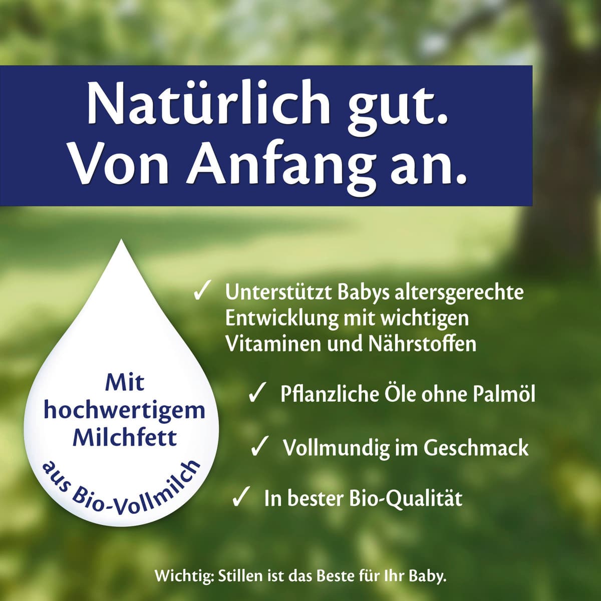 | Zutaten | MOLKENERZEUGNIS*, pflanzliche Öle* (Sonnenblumenöl*, Rapsöl*), VOLLMILCHPULVER* 18 %, LACTOSE*, Kaliumchlorid, Calciumcarbonat, FISCHÖL, Emulgator Lecithine* (SOJA), Natriumcitrat, Cholin, L-Tyrosin, Mortierella alpina-Öl, Vitamin C, Magnesiumcarbonat, L-Tryptophan, Taurin, Eisensulfat, Zinksulfat, Niacin, Vitamin E, Kupfersulfat, Pantothensäure, Vitamin A, Vitamin B1, Kaliumjodat, Vitamin B6, Folsäure, Calciumorthophosphate, Kaliumcitrat, Vitamin K, Natriumselenit, Mangansulfat, D-Biotin, Vitamin D, Vitamin B12. *aus biologischer Erzeugung |