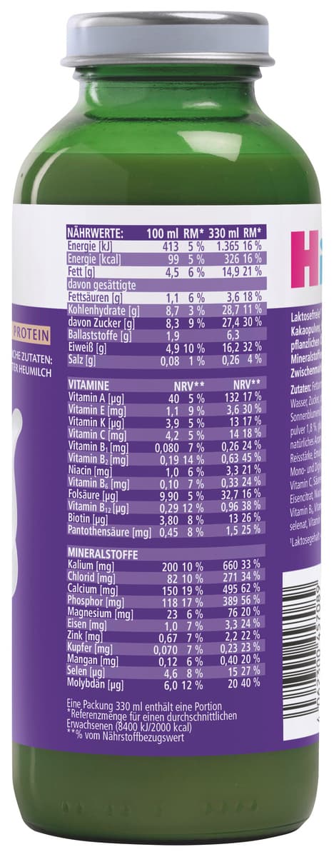 | Zutaten | Fettarme HEUMILCH laktosefrei 75 %, Wasser, Zucker, pflanzliche Öle 2,5 % (Rapsöl, Sonnenblumenöl), MILCHEIWEIß, Kakaopulver 1,8 %, glutenfreie HAFERFASERN, Inulin, natürliches Aroma, Emulgator Lecithine (SOJA), Reisstärke, Emulgator Citronensäureester von Mono- und Diglyceride von Speisefettsäuren, Vitamin C, Säureregulator Kaliumhydroxid, Eisencitrat, Niacin, Pantothensäure, Vitamin B1, Vitamin B6, Vitamin A, Folsäure, Natriumselenat, Vitamin K, D-Biotin. |