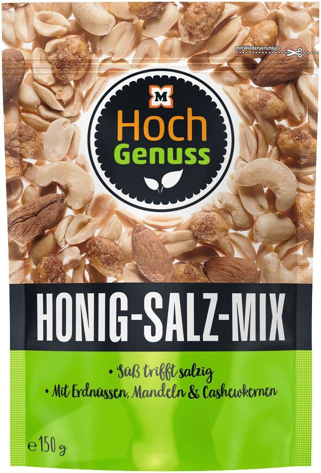 | Zutaten | 45 % gebrannte ERDNUSSKERNE (76 % ERDNUSSKERNE blanchiert, Zucker, 3,5 % Honig , 2 % Salz), 24 % ERDNUSSKERNE blanchiert und geröstet, 16 % MANDELKERNE geröstet, 14 % CASHEWKERNE geröstet, Sonnenblumenöl, 1 % Salz. |