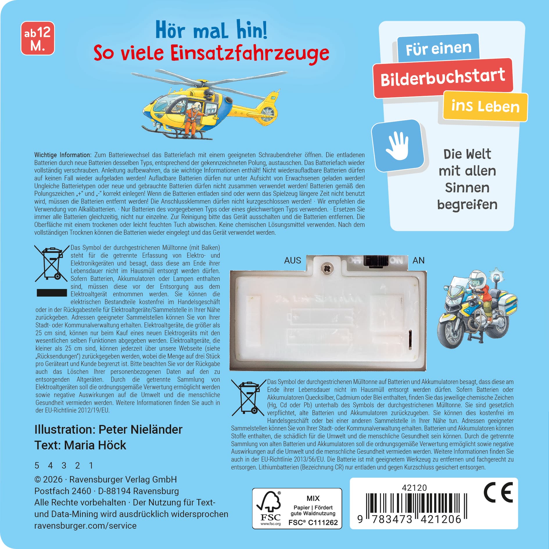 Durch Druck auf die Soundknöpfe werden die Geräusche aktiviert und schon Kleinkinder können die Fahrzeuggeräusche selbstständig auslösen. Die Geräusche sind in angenehmer Lautstärke und auf empfindliche Kinderohren abgestimmt. Die Bücher werden mit 2 handelsüblichen AAA-Batterien (mit einer Spannung von 1,5 V) ausgeliefert. Der praktische An-und Ausschalter sorgt dafür, dass die Batterien geschont werden. Sollten sich die Sounds nicht mehr auslösen lassen, sind die Batterien leer. Diese können einfach ausgetauscht werden.