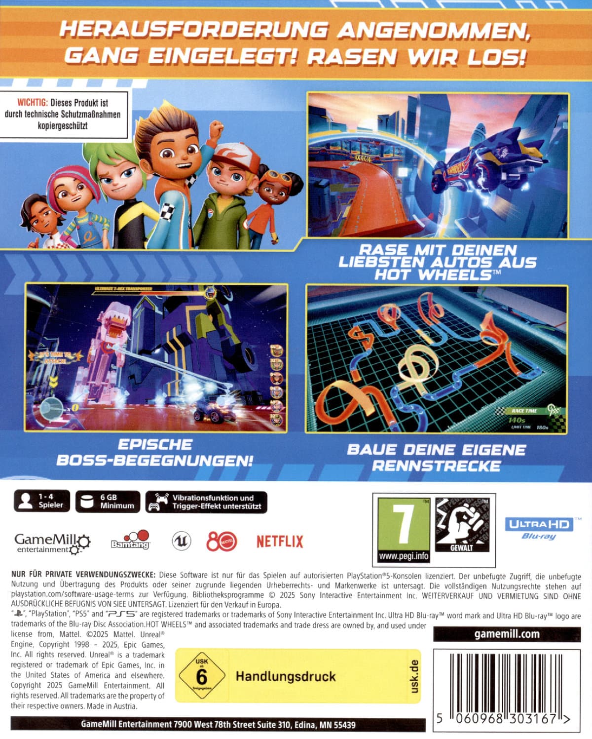Challenge Accepted, Gear Selected! Let’s Race! Es ist ein hochoktaniger Arcade-Racer mit kultigen Autos, epischen Strecken und actiongeladenem Gameplay, inspiriert von der erfolgreichen Netflix-Serie Hot Wheels Let's Race. Drifte durch wilde Kurse, nimm an riesigen Bosskämpfen teil und schalte eine Garage voller Fan-Favoriten frei. Mit Streckenbau, lokalem Multiplayer und Nonstop-Geschwindigkeit ist das Rennen immer in vollem Gange! IKONISCHE HOT WHEELS FAHRZEUGE & STRASSEN Wähle aus einer ganzen Garage kultiger Hot Wheels-Fahrzeuge, wie dem GT-Scorcher, Super Twin Mill, Roger Dodger und Duck N' Roll, jedes mit seinem eigenen einzigartigen Handling, seinen Fähigkeiten und seinem Stil. Zoomen Sie durch 12 wilde, überdrehte Strecken, die auf der Serie basieren. MEET THE RACERS Spiele als deine Lieblings-Hot Wheels Let's Race-Charaktere wie Coop, Spark, Mac, Brights, Axle und Cruise. MEHR MODEN, MEHR SPASS Es gibt fünf spannende Spielmodi, darunter Racing Camp, Cup Champ, Speed Trials, Track Builder und Free Races. Im Track Builder-Modus kannst du deinen Traumkurs mit all deinen eigenen Kurven erstellen! BOSS SHOWDOWNS Kämpfe gegen gewaltige Bosse wie Professor Rearviews Riesenkobra und seinen feuerspeienden Drachen in rasanten, actiongeladenen Kämpfen auf der Strecke. Jeder Showdown sorgt für rasanten Nervenkitzel und epische Momente. ULTIMATE CUSTOMIZATION Verdiene Flammenabzeichen, um neue Autos, Aufkleber und Streckenteile in der Ultimativen Garage freizuschalten. Gestalte dein eigenes Hot Wheels-Auto und zeige es auf der Rennstrecke. WETTBEWERBEN SIE SOLO ODER RENNEN SIE IM MEHRSPIELER Spielen Sie sich durch eine spannende Solokampagne mit lustigen Herausforderungen oder messen Sie sich mit Freunden im 4-Spieler-Split-Screen-Rennen! FAMILIENFREUNDLICHES RENNEN Erlebe eine schnelle, flüssige und familienfreundliche Steuerung mit driftorientiertem Gameplay, das für spannende Kopf-an-Kopf-Rennen entwickelt wurde. Spielsrpache Englisch, Texte Deutsch