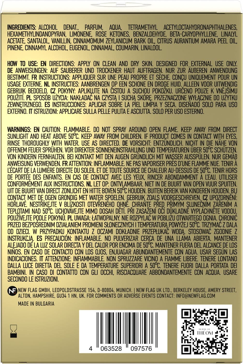 | Inhaltsstoffe | INGREDIENTS: ALCOHOL DENAT., PARFUM, AQUA, TETRAMETHYL ACETYLOCTAHYDRONAPHTHALENES, HEXAMETHYLINDANOPYRAN, LIMONENE, ROSE KETONES, BENZALDEHYDE, BETA-CARYOPHYLLENE, LINALYL ACETATE, SANTALOL, VANILLIN, CINNAMOMUM ZEYLANICUM BARK OIL, CITRUS AURANTIUM AMARA PEEL OIL, PINENE, CINNAMYL ALCOHOL, EUGENOL, CINNAMAL, COUMARIN, LINALOOL. |