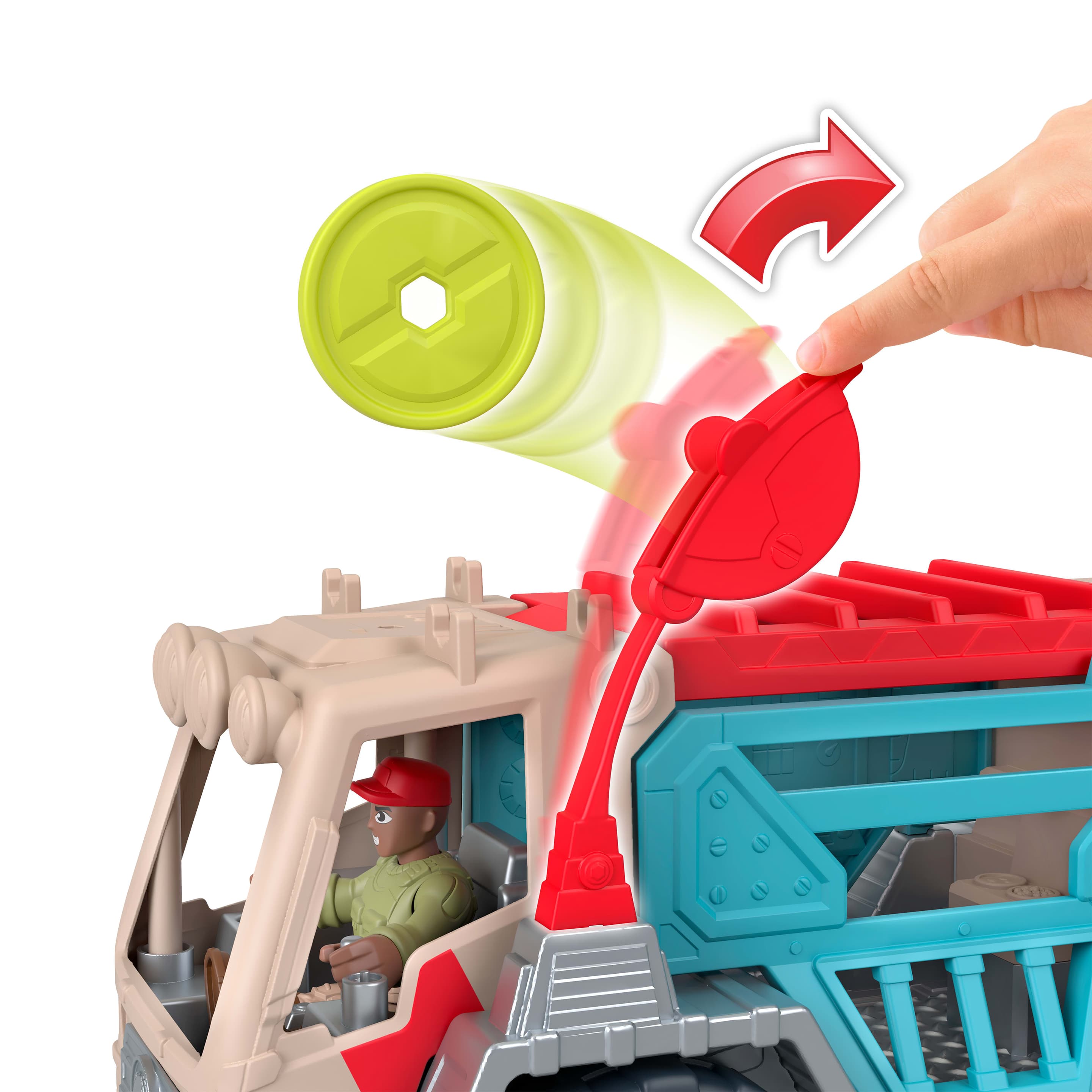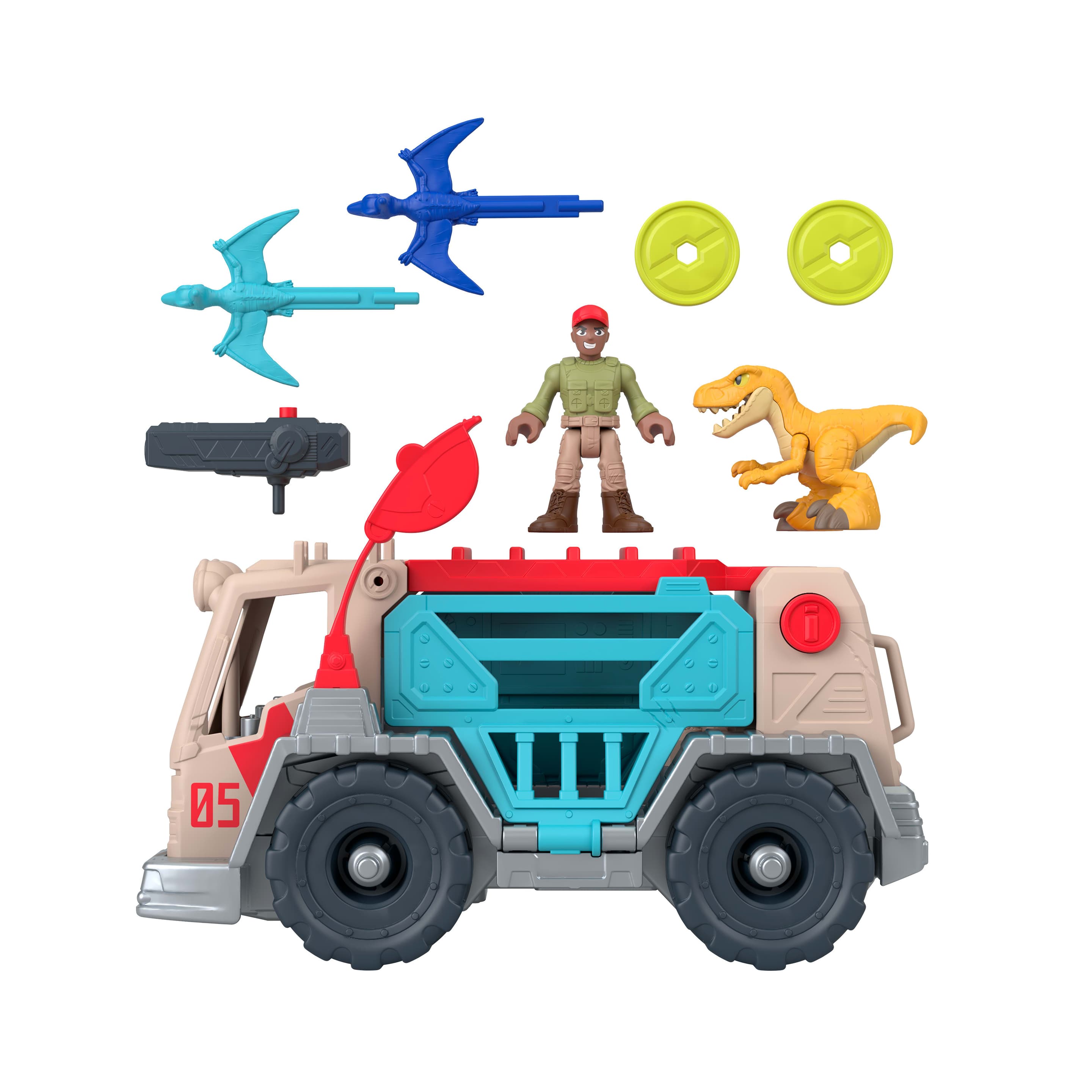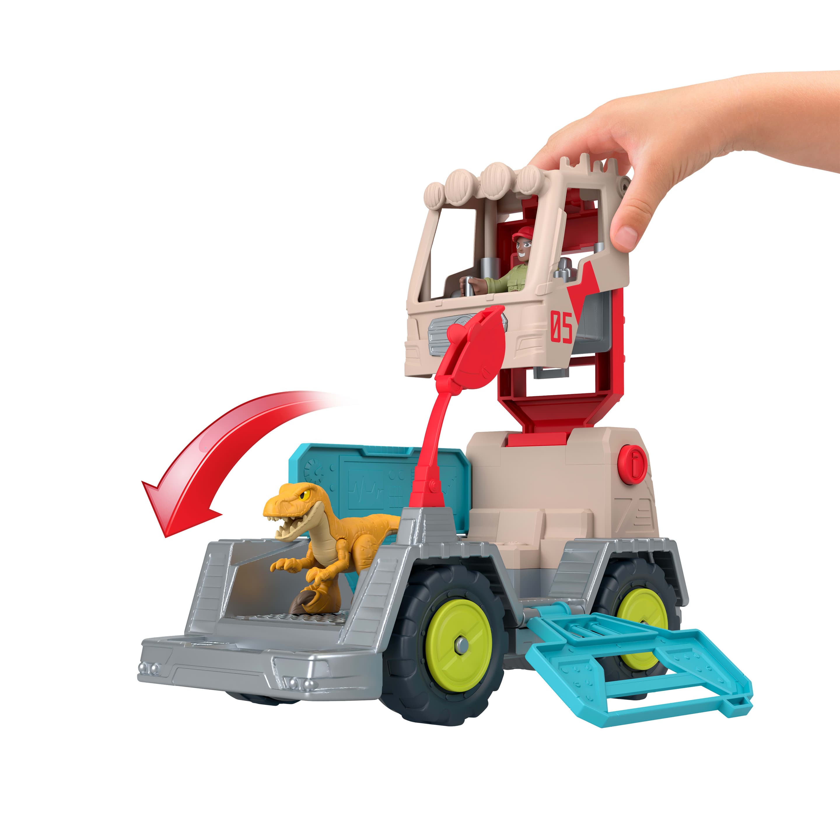Im Capture‑Modus können kleine Abenteurer den 9,5 Zoll langen Truck nutzen, um Dinosaurier sicher zu transportieren. Die herunterklappbare Rampe erleichtert das Ein‑ und Aussteigen des beigelegten Raptors. Wird das Fahrzeug transformiert, entsteht ein 9,5 Zoll hohes mobiles Pflegezentrum mit X‑Ray‑Scanner, Command‑Tower und Projektil‑Launcher, der zwei Pteranodon‑Projektile abfeuern kann.