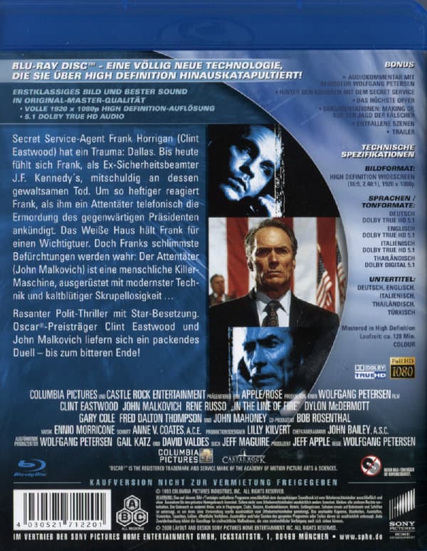 | Zusatzinfos / Bonusmaterial beim Film dabei | Audiokommentar mit Regisseur Wolfgang Petersen; Hinter den Kulissen mit dem Secret Service; Das höchste Opfer; Dokumentation "Making of"; Dokumentation "Auf der Jagd der Fälscher"; Entfallene Szenen; Trailer; |