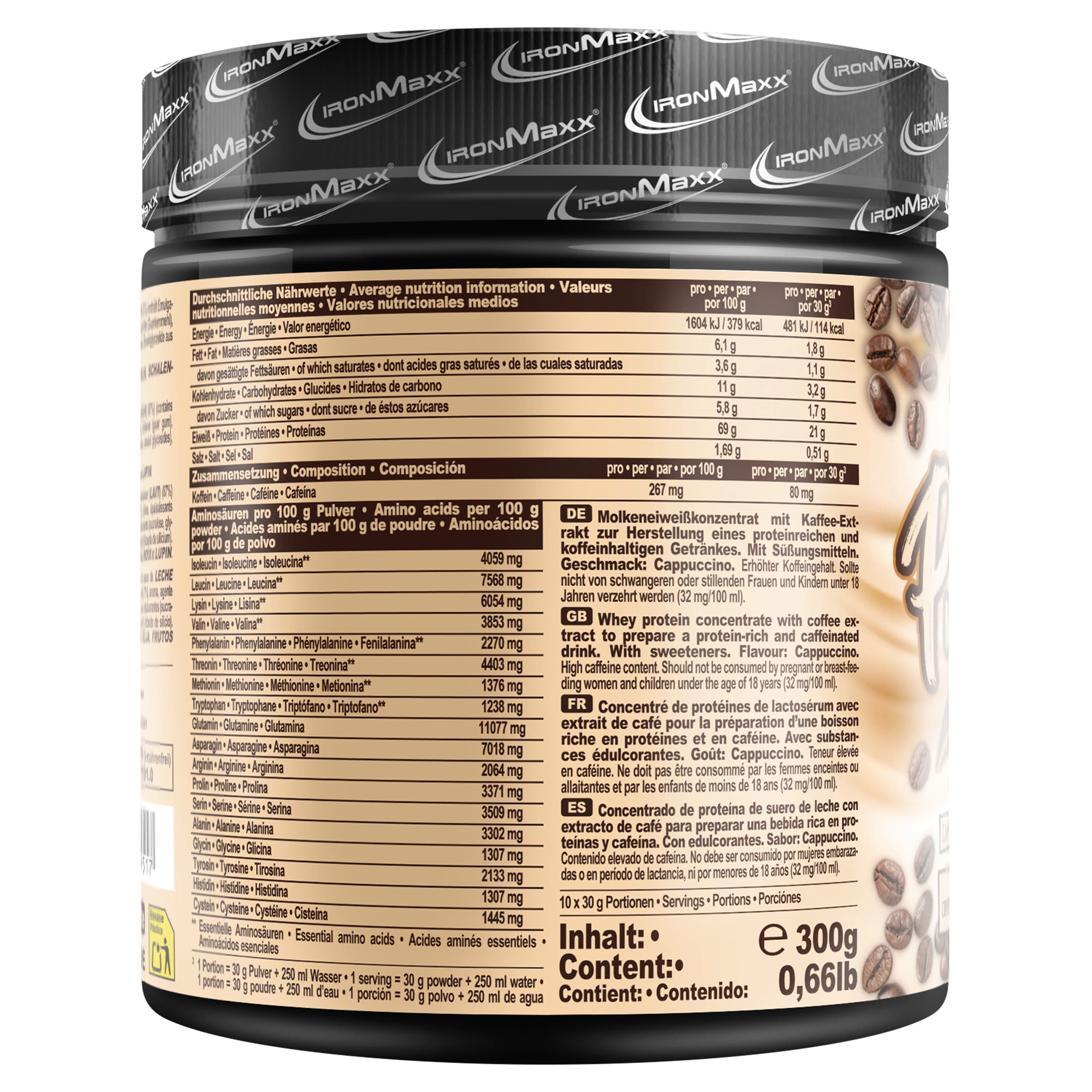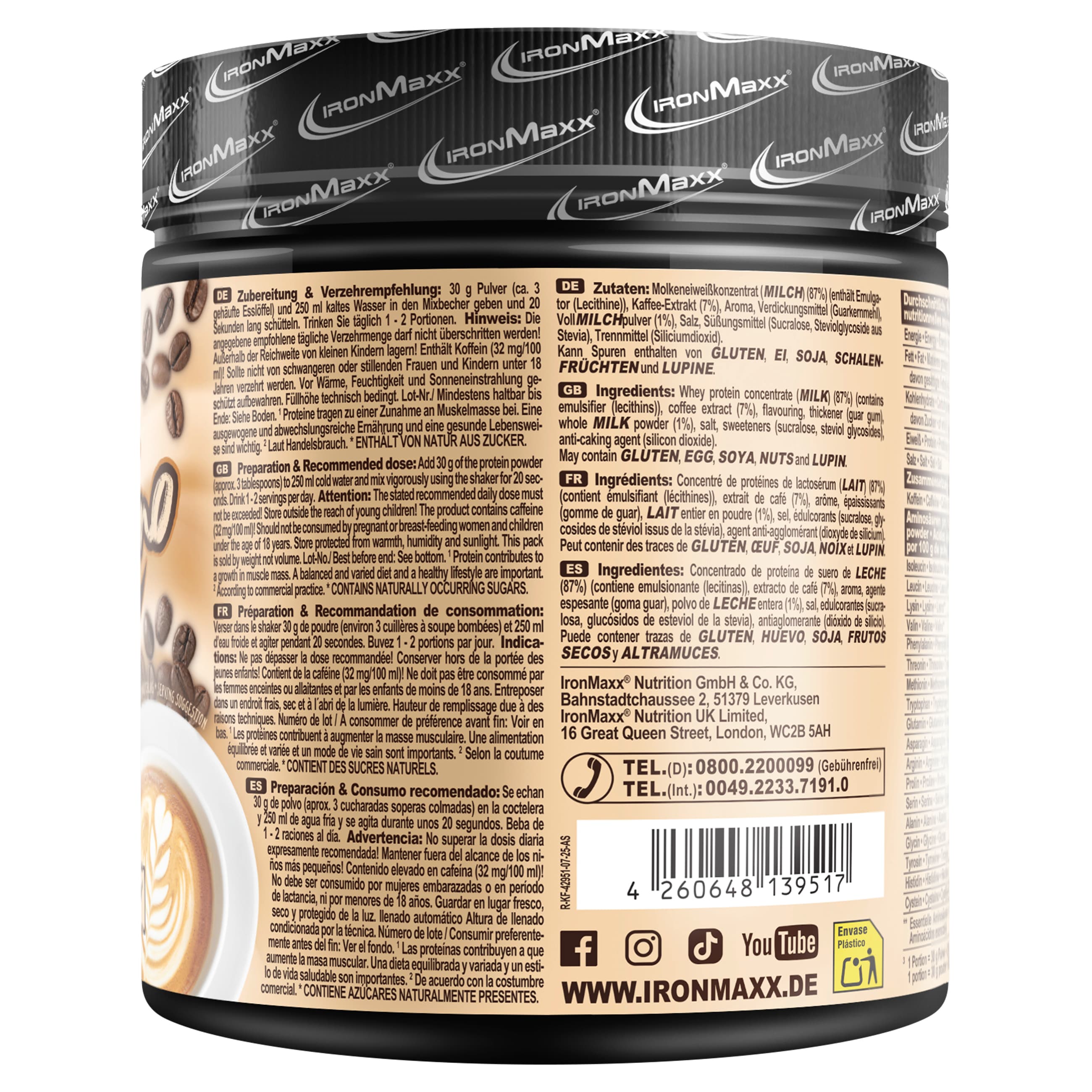 Nahrungsergänzungsmittel: Kaffee oder Protein? Mit dem IronMaxx® Proteccino bekommst du beides – in einem cremigen Instant-Drink, der echten Kaffee-Extrakt mit bis zu 69% Molkeneiweiß kombiniert. Ob als Frühstücks-Booster, Pre-Workout oder proteinreicher Genussmoment zwischendurch: Der Proteccino liefert dir 80mg Koffein pro Portion, wertvolles Eiweiß, ein volles Aminosäurenprofil und das alles ohne Zuckerzusatz oder Konservierungsstoffe. In leckeren Sorten wie Cappuccino oder Schokolade – für bewussten Lifestyle und vollen Geschmack.