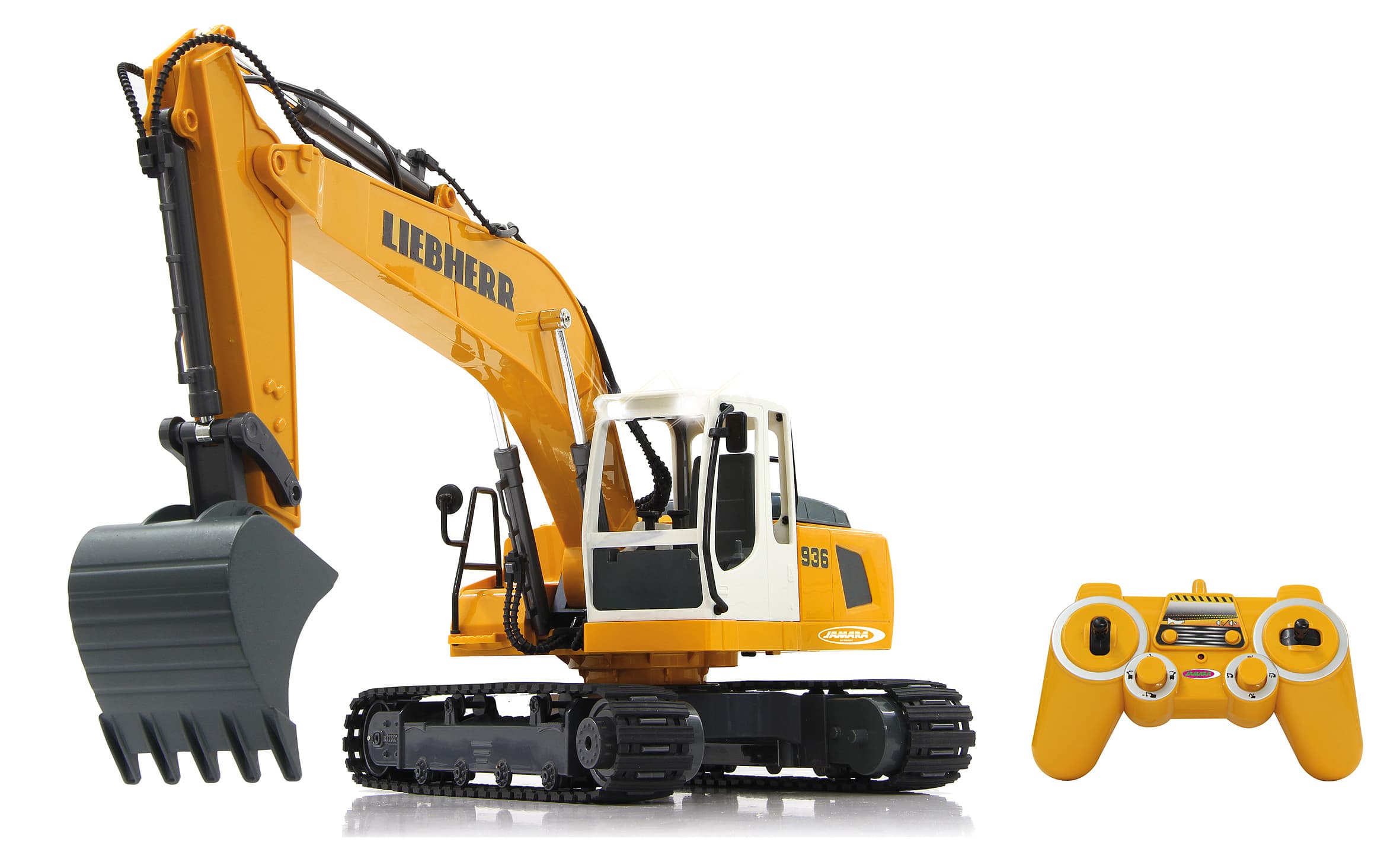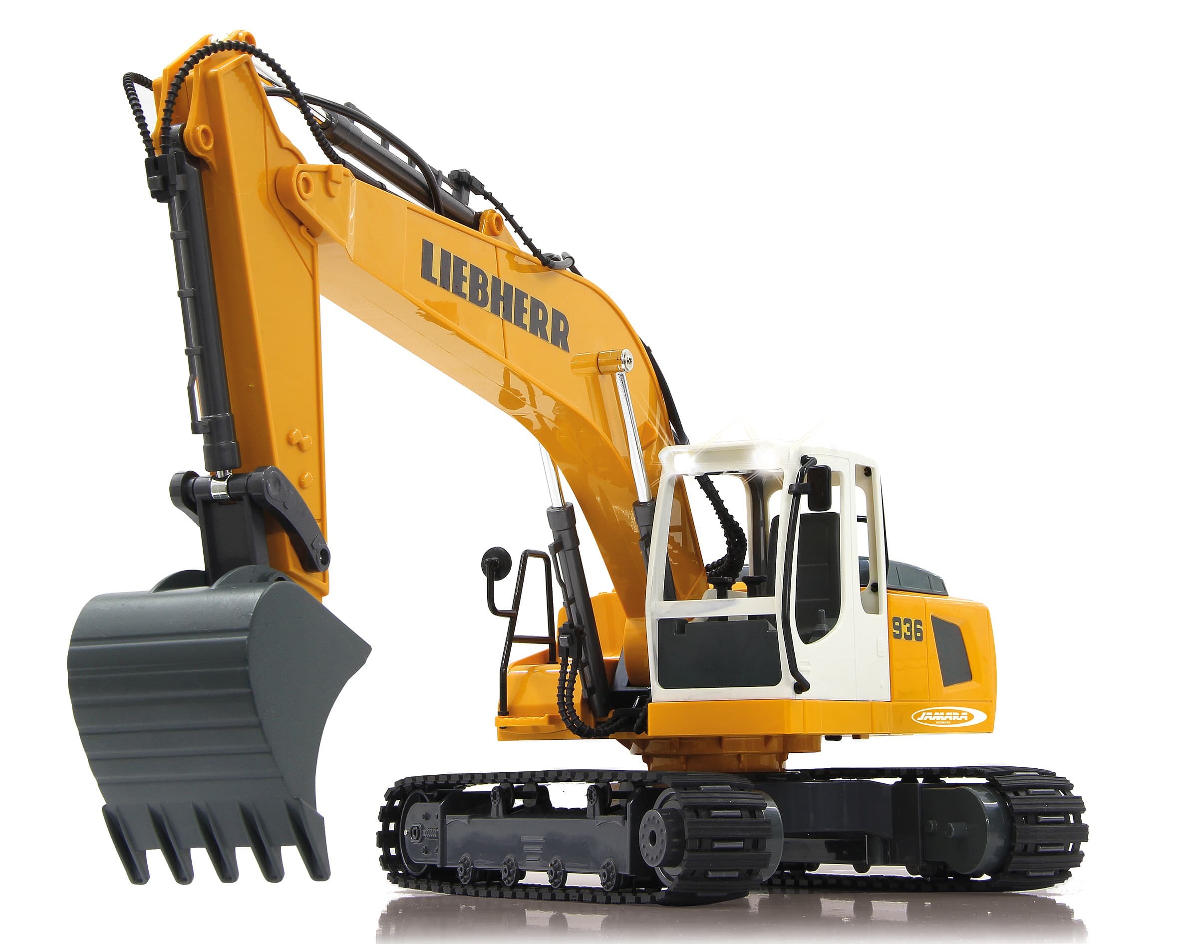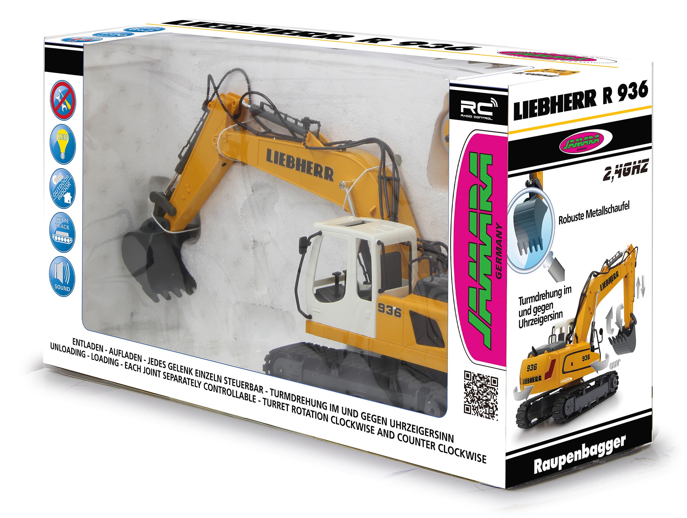Der Liebherr Bagger R 936 von Jamara ergänzt die große 1:2 Baumaschinen-Serie um ein weiteres Highlight. Der Liebherr Bagger wurde vom Hersteller offiziell lizenziert und verfügt über echte Funktionalitäten, die wir vom großen Original abgeschaut haben. So lassen sich z.B. alle Gelenke des Raupenbaggers mit der 2,4 GHz Funkfernsteuerung einzeln ansteuern ebenso wie die 66° Turmdrehung im- und gegen den Uhrzeigersinn. Neben der großen robusten Metallschaufel zum Be- und Entladen gibt es weitere Anbauwerkzeuge als Zubehör (nicht im Lieferumfang), wie den Schalengreifer mit Ball und einen Abbruchhammer. Die Anbaugeräte können problemlos ohne Werkzeug am Greifarm montiert und demontiert werden. Die Sound-Palette des Baggers reicht vom realistischen Motorsound (abschaltbar) über die Hupe bis hin zum Rückfahrwarnsound. Der Liebherr R936 verfügt über eine Autoabschaltfunktion. Alle diese Kriterien machen den Liebherr-Bagger zum unverzichtbaren Helfer auf jeder Wohn- und Kinderzimmerbaustelle.