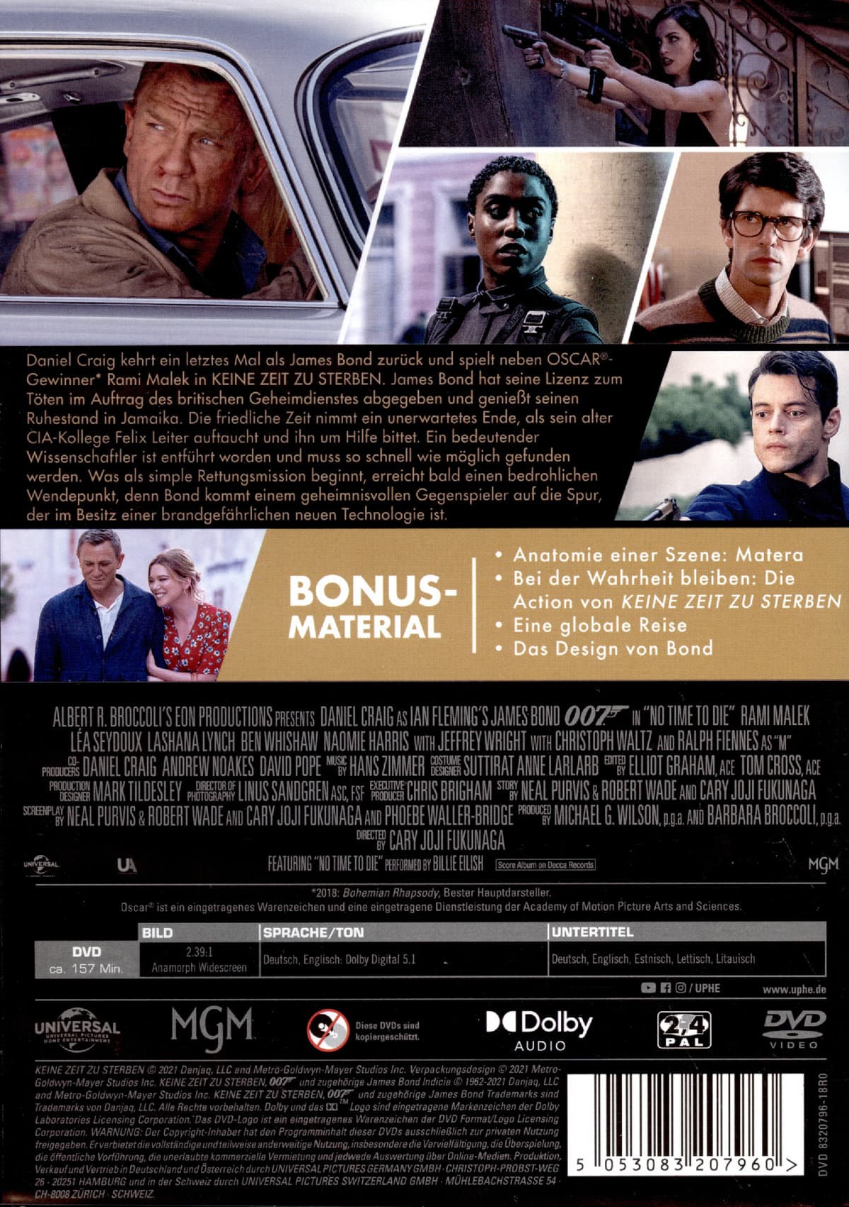 | Zusatzinfos / Bonusmaterial beim Film dabei | Enthält Bonus-DVD, Anatomie einer Szene: Matera, Bei der Wahrheit bleiben: Die Action von "Keine Zeit zu sterben", Eine globale Reise, Das Design von Bond |