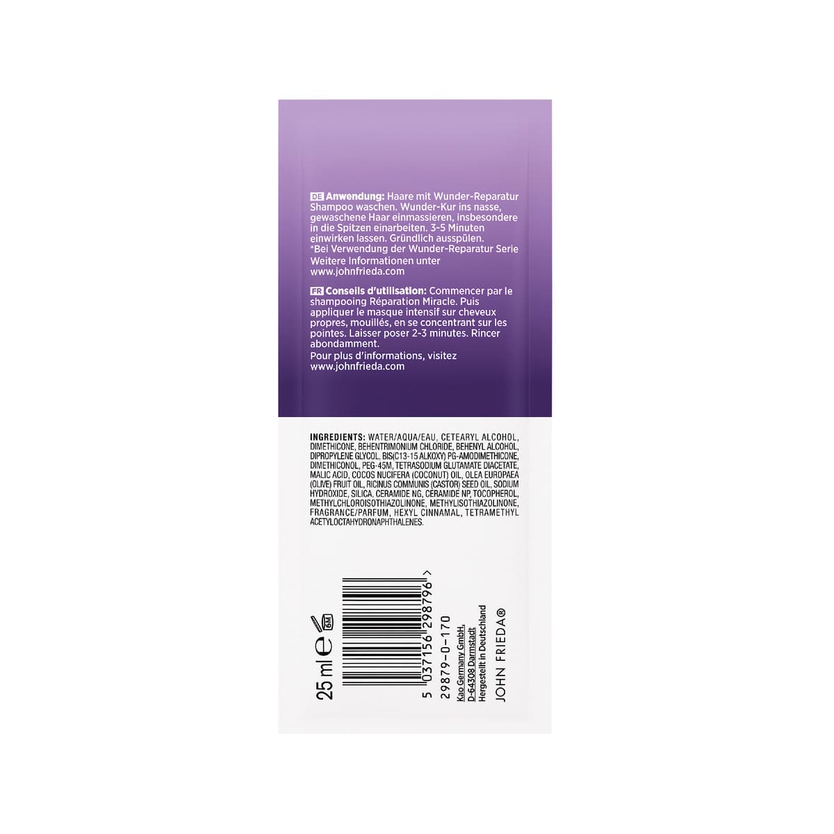 | Anwendungshinweis | Haare mit Wunder-Reparatur Shampoo waschen. Wunder-Kur ins nasse, gewaschene Haar einmassieren, insbesondere in die Spitzen einarbeiten. 3-5 Minuten einwirken lassen. Gründlich ausspülen. |