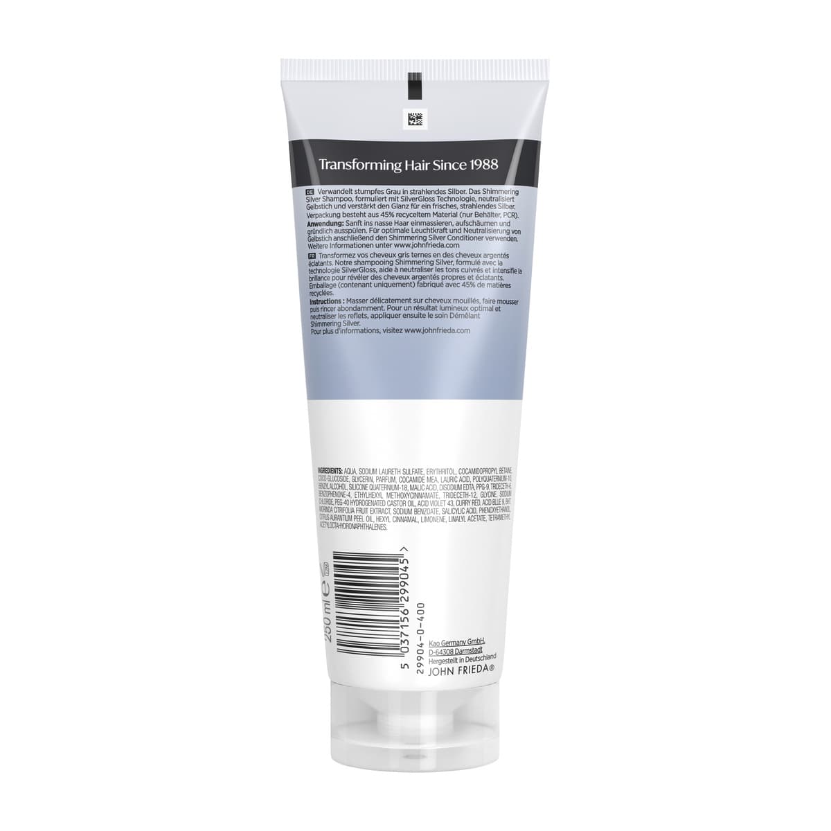 | Anwendungshinweis | Sanft ins nasse Haar einmassieren, aufschäumen und gründlich ausspülen. Für optimale Leuchtkraft und Neutralisierung von Gelbstich anschließend den Shimmering Silver Conditioner verwenden. |
