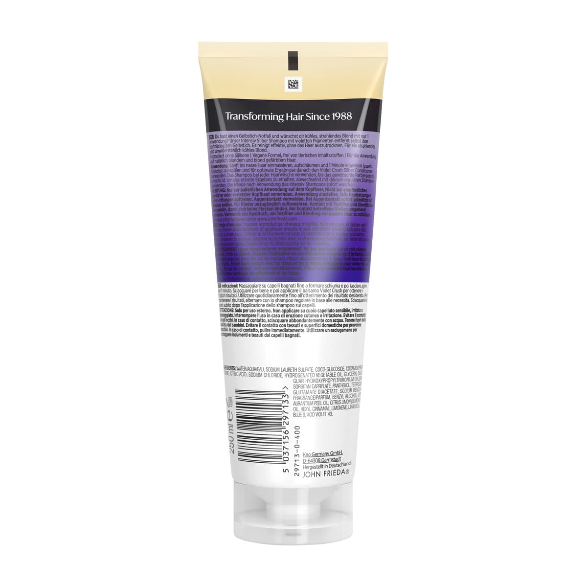 | Anwendungshinweis | Sanft ins nasse Haar einmassieren, aufschäumen und 1 Minute einwirken lassen. Gründlich ausspülen und für optimale Ergebnisse danach den Violet Crush Silber Conditioner verwenden. Um das erzielte Ergebnis zu erhalten, abwechselnd mit deinem regulären Shampoo verwenden. Die Hände nach Verwendung des Intensiv Shampoos sofort waschen. |