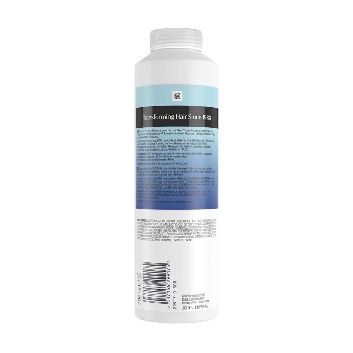 Voluminös und federleicht. Unsere Volume Lift Kollektion sorgt für luftige Fülle mit natürlicher Bewegung – vom Waschen bis zum Styling. Individuell für dich Volumen beginnt mit der richtigen Formel – von maximalem Ansatz-Lift bis zu geschmeidigem Halt. Warum Volume Lift? So wirkt es Speziell für feines oder dünneres Haar entwickelt, schenkt die Volume Lift Kollektion sofortiges Volumen und langanhaltende Fülle. Das Haar wirkt mit jeder Anwendung kräftiger und sichtbar dichter. 1. Polstert jede Strähne auf - Für sofort dicker wirkendes Haar. 2. Hebt an & stärkt- Verleiht Volumen und kräftigt jede einzelne Strähne. 3. Schwereloses Volumen - Langanhaltende Fülle mit leichtem Haargefühl. JOHN FRIEDA – IKONISCH SEIT 1988 Haare sind niemals einfach nur Haare. Sie stehen für Ausdruck, Selbstbewusstsein, Individualität – und die Kraft, sich jeden Tag als die beste Version seiner selbst zu fühlen. Haare können die Stimmung eines Tages im Handumdrehen verändern. Wir verstehen das. Deshalb sind wir jeden Tag aufs Neue inspiriert, Salonqualität direkt zu dir nach Hause zu bringen. 1988, in einem Salon im Westen Londons, entfachte die Faszination eines Mannes für Haare etwas Größeres. Alltägliche Looks wurden zu kulturellen Momenten. John Frieda entwickelte sich von einem Namen aus der Nachbarschaft zu einer globalen Bewegung – und die ersten Produktikonen bewiesen es eindrucksvoll: die "Thickening Lotion", die feinem Haar die Fülle verlieh, die es verdient, und das Frizz-Ease Serum, das widerspenstiges Haar endgültig von Frizz befreite. Keine leeren Versprechen – sondern echte Salonergebnisse, mühelos für alle, überall. Unsere Mission ist unverändert, doch unsere Lösungen sind präziser denn je. In Zusammenarbeit mit Stylist:innen, Haarpflegeexpert:innen und führenden Forschungszentren – alle mit jahrzehntelanger Erfahrung – vereinen wir Wissenschaft und Salon-Expertise, um gezielte Haarpflege-Lösungen zu entwickeln, die auf individuelle Bedürfnisse abgestimmt sind. Haare sind unsere Leidenschaft. Ob glatte, frizzfreie Perfektion, voluminöse Wellen oder ein noch strahlenderes Blond – wir bieten weltweit Salonqualität für echte Haartransformationen und erfüllen individuelle Bedürfnisse in Echtzeit. Bei John Frieda glauben wir daran, dass kein Moment im Leben zu klein oder zu unbedeutend für großartiges Haar ist. Oder für das Selbstbewusstsein, das damit einhergeht. Wo immer du bist und was immer du tust – mit John Frieda erlebst du jeden Tag dieses unverwechselbare Gefühl von 'Salon-Attitude'.