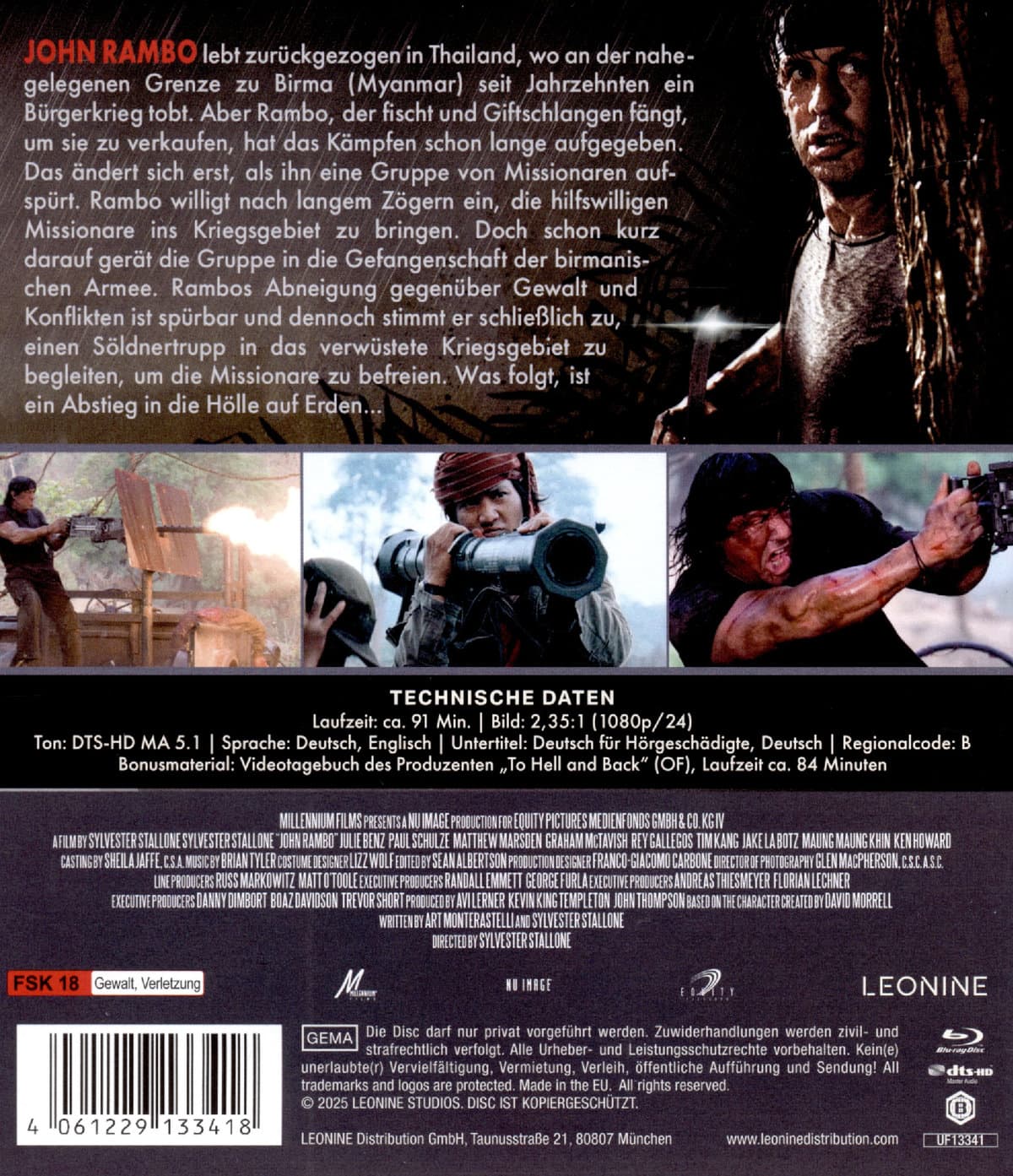John Rambo führt ein zurückgezogenes Leben im Norden Thailands. An der Grenze des Landes zu Burma wütet allerdings schon seit sechzig Jahren der weltweit längste Bürgerkrieg: der Burmesen-Karen Konflikt. Rambo, der in den Bergen lebt, und seinen Lebensunterhalt mit dem Verkauf selbst gefangener, giftiger Schlangen verdient hat das Kämpfen jedoch schon lange aufgegeben. Das ändert sich auch nicht, als Sanitäter, Rebellen und Flüchtligen an ihm vorbei durch das von Krieg zerrüttete Land ziehen. All dies soll sich aber ändern, als eine Gruppe von Missionaren auftaucht und den »Amerikanischen-Fluss-Führer« Rambo bittet, sie den Fluss hinauf zu einem Flüchtlingslager zu führen, da Tretminen die Reise dorthin zu gefährlich macht. Sie wollen den dort lebenden, verfolgten Bergstamm Karen mit Medizin, Nahrungsmitteln und Bibeln versorgen. Zögernd willigt Rambo schließlich ein, sie und die anderen Helfer zu führen. Wochen später erfährt Rambo, dass die Missionare nicht vom Flüchtlingslager zurückgekehrt sein, die Helfer aber lebend gesehen worden sind, eingeschlossen in einem Burmesischen Armee-Camp. Obgleich Rambos Abneigung gegen Gewalt noch immer allgegenwärtig ist, weiß er, dass seine Hilfe notwendig ist. Was dann folgt ist der Abstieg in die Hölle auf Erden. Enhält: - 4K Ultra HD (Uncut Version) - Blu-ray (Uncut Version+Bonusmaterial) - Bonus-Blu-ray (Extended Cut, OV/OmU) - 44-seitiges Booklet