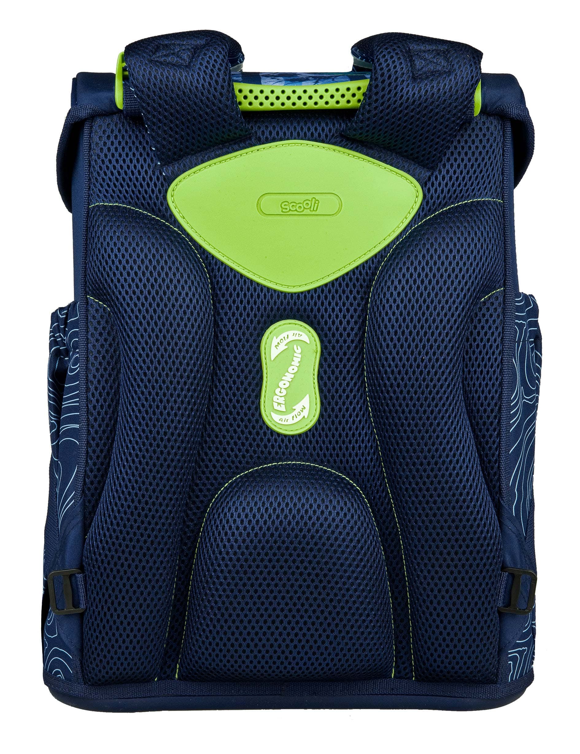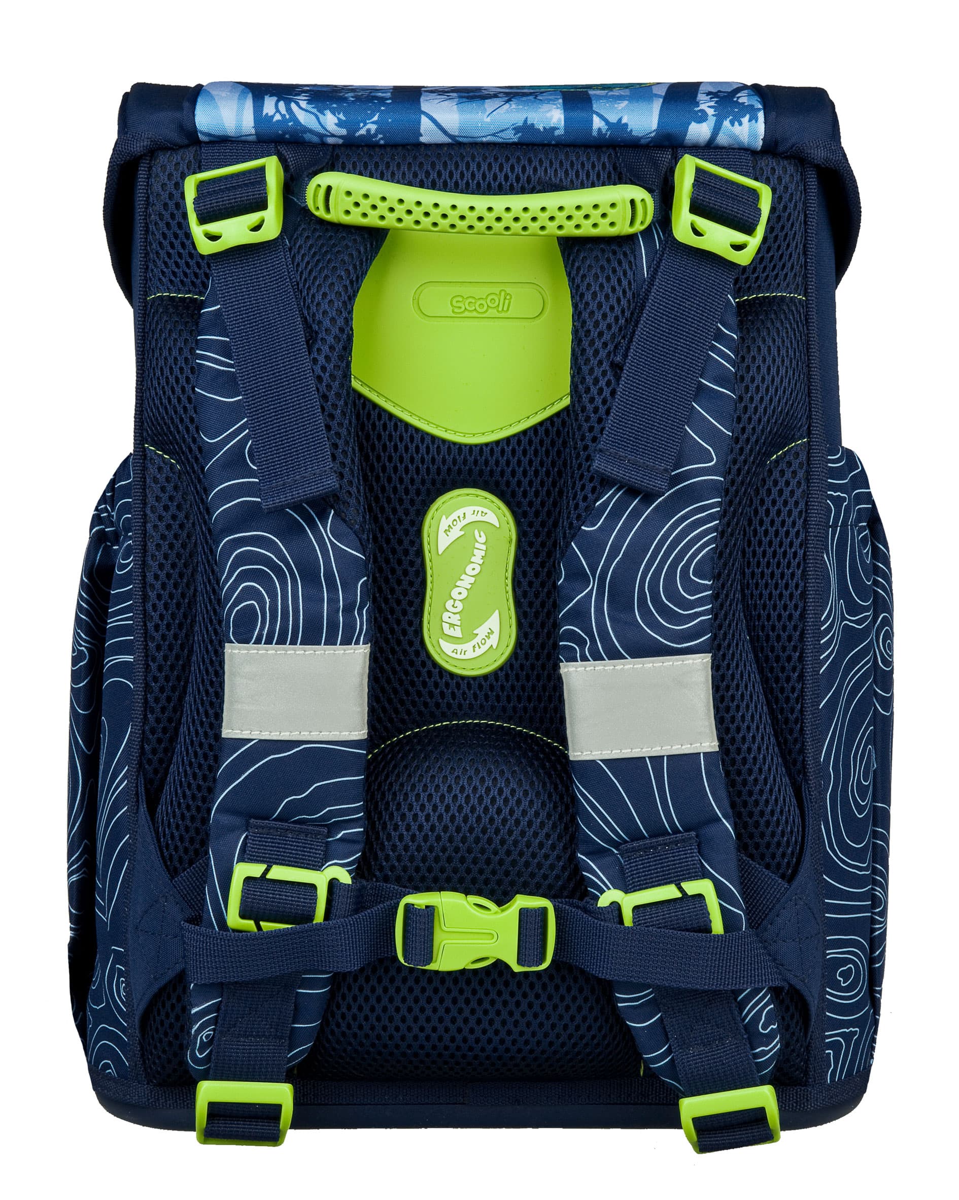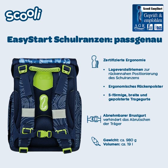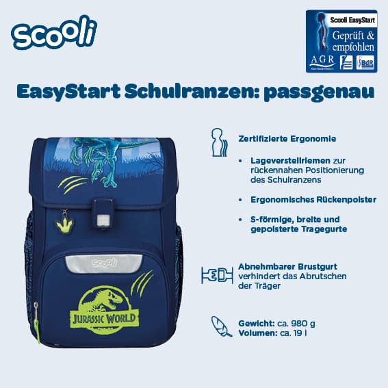 Der Scooli EasyStart Schulranzen im beliebten Dino Design begeistert mit einem abenteurlichen Look und durchdachter Ergonomie: Ausgezeichnet mit dem Gütesiegel Aktion Gesunder Rücken e.V. (AGR), lässt sich der Ranzen individuell an die Anatomie des Kindes anpassen. Mit nur ca. 980 g Gewicht ist er besonders leicht und durch sein schlankes Design ideal für Schulanfänger. Ein ergonomisches, atmungsaktives Rückenpolster, ein abnehmbarer Brustgurt und Lageverstellriemen sorgen für einen komfortablen, rückenschonenden Sitz.