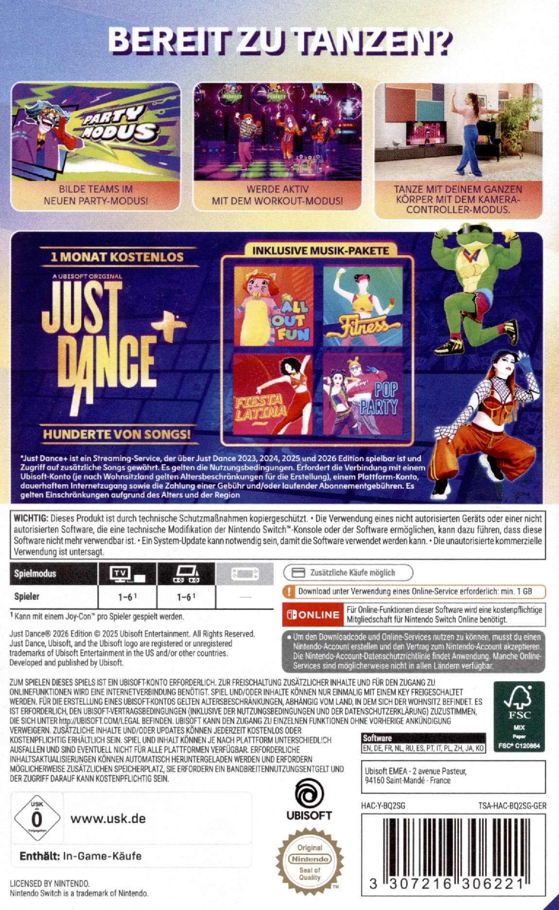 *Just Dance+ ist ein Streaming-Service, der über Just Dance 2023, 2024, 2025 oder 2026 Edition spielbar ist und Zugriff auf zusätzliche Songs gewährt. Erfordert die Verbindung mit einem Ubisoft-Konto (je nach Wohnsitzland gelten Altersbeschränkungen für die Erstellung), permanenten Internetzugang und die Zahlung einer Gebühr und\oder einer fortlaufenden Abonnementgebühr. Nicht kompatibel mit Just Dance 2022 oder älteren Versionen des Spiels.