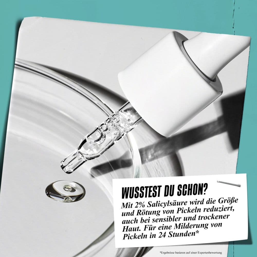 | Anwendungshinweis | Einen Tropfen auf die Fingerspitze geben und direkt auf den Pickel tupfen. Verteile eine dünne Schicht als letzten Schritt Deiner Hautpflege-Routine (ohne zu viel zu reiben). Lass unser Salicyl-Pickel Patch vollständig trocknen bevor Du Sonnenschutz und/oder Make-up aufträgst. Kann morgens und abends aufgetragen werden. |