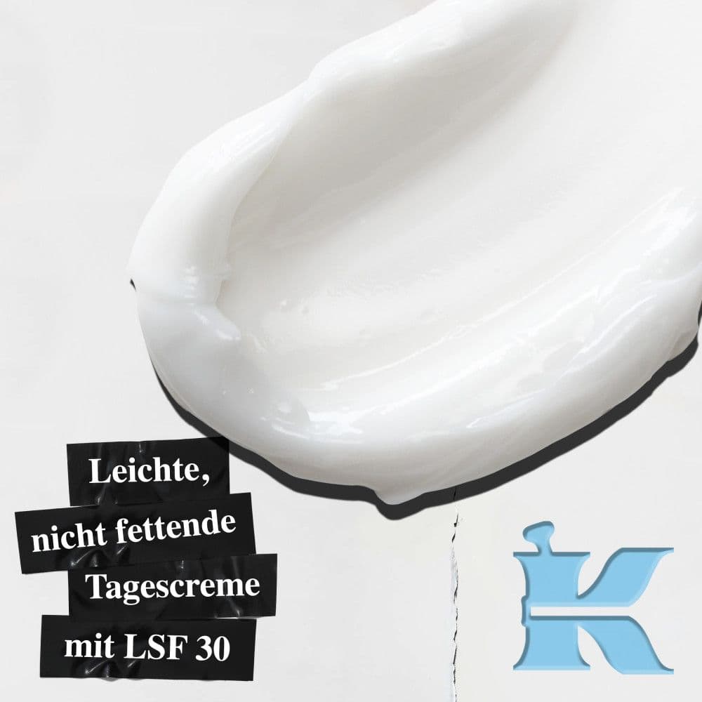 Die Pflege versorgt die Haut ergiebig mitFeuchtigkeit und hinterlässt ein sanftes Hautgefühl.Durch den Lichtschutzfaktor 30 wird die Haut vor den Belastungen durch Sonnenstrahlen geschützt und verhindert somit das frühzeitige Altern der Haut.Die Pflege ist rund um die Uhr anwendbar.Die Textur deiner Haut wird sichtlich verbessert durch die regelmäßige Anwendung der Pflege.