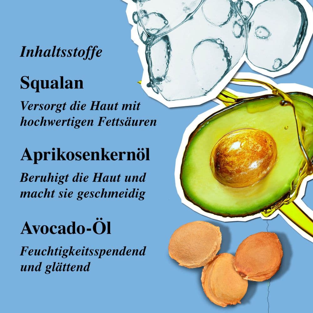| Inhaltsstoffe | 685376 45 - INGREDIENTS: AQUA / WATER • GLYCERIN • SQUALANE • PHENOXYETHANOL • ACRYLATES/C10-30 ALKYL ACRYLATE CROSSPOLYMER • SORBITAN OLEATE • DICAPRYLYL ETHER • POTASSIUM SORBATE • PEG-100 STEARATE • ASCORBYL GLUCOSIDE • SODIUM HYDROXIDE • TOCOPHEROL • SODIUM HYALURONATE • PRUNUS AMYGDALUS DULCIS OIL / SWEET ALMOND OIL • PRUNUS ARMENIACA KERNEL OIL / APRICOT KERNEL OIL • PERSEA GRATISSIMA OIL / AVOCADO OIL (F.I.L. Z299023/1). |
