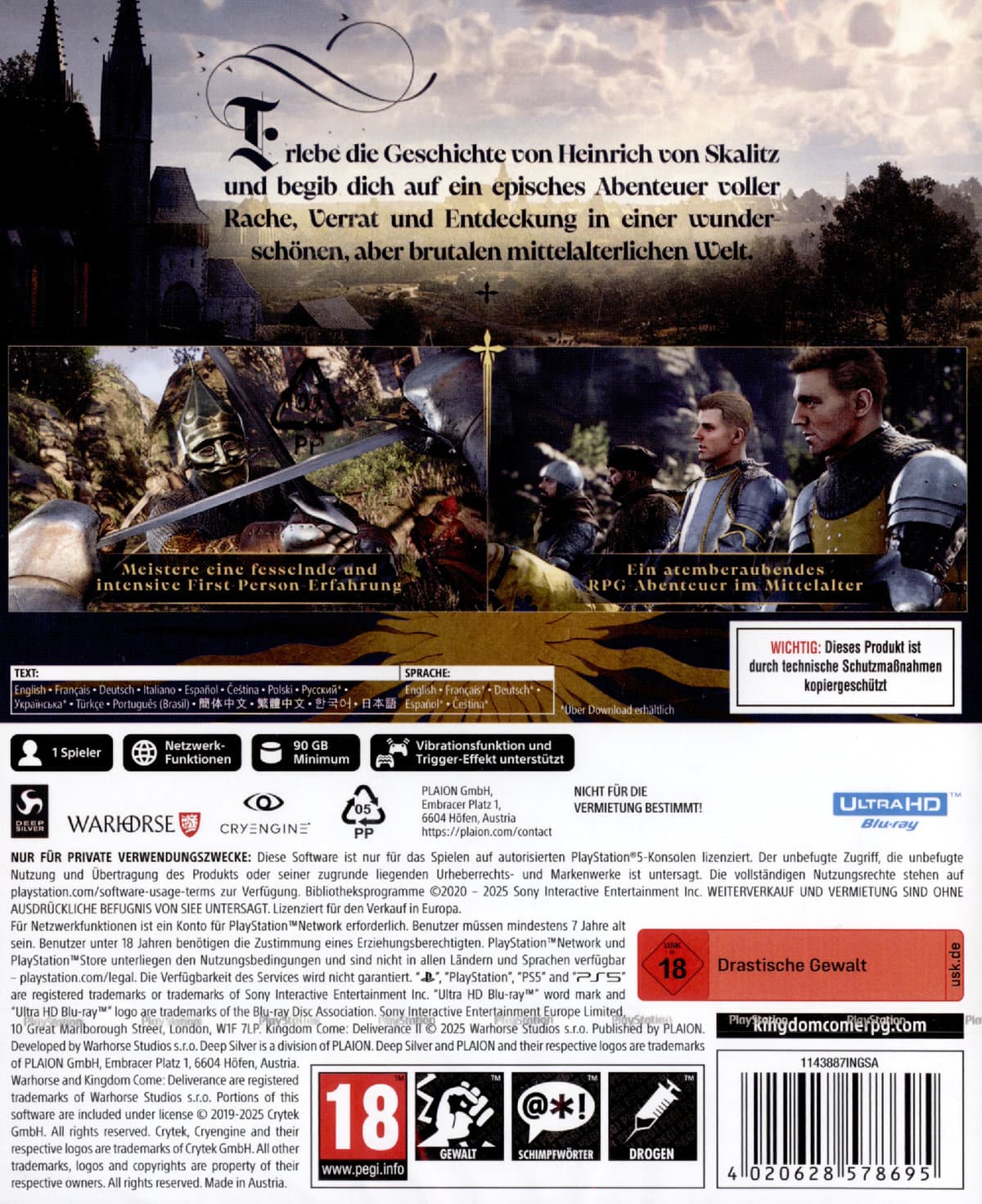 Kingdom Come Deliverance II ist ein spannendes Action-RPG, das in den Wirren eines Bürgerkriegs im Böhmen des 15. Jahrhunderts spielt. Eine fesselnde Geschichte über Rache, Mut und Entdeckung. Begib dich auf eine epische Reise von einer bescheidenen Schmiede zum Hof des Königs. Königreich Böhmen, frühes 15. Jahrhundert: Das Chaos ist über das Reich hereingebrochen. Während die Invasoren das herrscherlose Land plündern und Furcht und Schrecken verbreiten, ist Heinrich von Skalitz auf der Suche nach Vergeltung für den Mord an seiner Familie. Als Vertrauter der Verbündeten des rechtmäßigen Königs wird Heinrich ausgesandt, um Sir Hans Capon auf einer diplomatischen Mission zu beschützen. Nachdem sie in einen Hinterhalt geraten und nur knapp mit dem Leben davonkommen, begeben sich die beiden auf eine Reihe von Abenteuern, die ihre Fähigkeiten, ihren Charakter und ihre Freundschaft auf die entscheidende Probe stellen. Du bist Heinrich von Skalitz - ein gewöhnlicher Mann, der außergewöhnliche Dinge tut - und begibst dich in einer fesselnden Geschichte von Rache, Verrat und Entdeckung auf eine epische Reise "von einer bescheidenen Schmiede zum Hof des Königs", während du in dieser schönen, aber brutalen mittelalterlichen Welt nach deiner Bestimmung suchst. Entdecke die offene Spielwelt eines mittelalterlichen Europas - von belebten Straßen bis zu üppigen Wäldern - und erlebe ein unvergessliches Abenteuer voller Action, Spannung und Wunder. FEATURES: • Eine Geschichte von Liebe und Vergeltung: Erlebe die Ereignisse mit den Augen Heinrichs, eines jungen Mannes, der loszieht, um den Mord an seinen Eltern zu rächen. Im Verlauf seiner Geschichte - mit über fünf Stunden eindrucksvoller Zwischensequenzen - entwickelt er sich vom ehrgeizigen Krieger zum Rebellen, begegnet unterwegs einer Vielzahl charismatischer Charaktere, besteht unvergessliche Abenteuer, und kämpft schließlich gegen den König von Ungarn, Sigismund den Roten Fuchs, und seine furchterregenden Verbündeten. • Ein echtes RPG-Erlebnis: Deine Aktionen bestimmen Heinrichs Schicksal und wie die Welt auf ihn reagiert. Passe sein Aussehen, seine Fähigkeiten und seine Ausrüstung nach Belieben an und wähle, mit welcher moralischen Einstellung du den Ereignissen um dich herum begegnest. Widme dich auf deiner Reise einzigartigen Tätigkeiten wie Schmieden und Bogenschießen und erlebe hautnah diese lebendige Region Europas, in der man deine Taten für immer erinnern wird. • Erkunde das mittelalterliche Leben: Diese erstaunlich authentische Wiedergabe des Böhmens des 15. Jahrhunderts gibt dir die Möglichkeit, diese faszinierende Umgebung wie nie zuvor zu erleben. Verlaufe dich in einer großen Stadt, sprich mit Bauern und Adligen und erkunde das weite und vielseitige Land mit Tavernen, Badehäusern, Schlössern und mehr. • Authentische Kämpfe in der Egoperspektive: Spüre das Klirren des Stahls und den unerbittlichen Kampf in packenden Echtzeit-Schlachten. Eine Vielfalt von originalgetreuen Waffen und Kampfstilen bietet für jeden Spieler eine passende Wahl. Ob zu Fuß, zu Pferd oder lautlos - spezialisiere dich in eleganter Schwertkunst, brutalen stumpfen Waffen oder tödlichen Angriffen aus der Ferne. Spiel komplett in Deutsch!