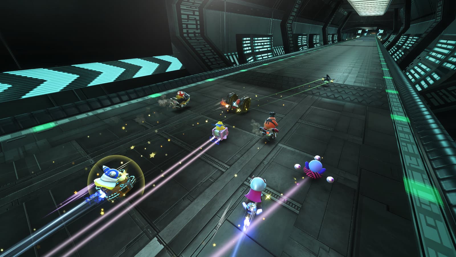 Falls dir der Sinn mehr nach reinem Rennvergnügen steht, dann sieh dir Air Ride an: ein temporeicher Spurt bis zur Ziellinie, bei dem du gegen fünf weitere Spieler fahren oder online oder lokal antreten kannst. Remple andere Fahrer an oder halte dich dicht hinter ihnen, um Sterne einzusammeln. Diese verleihen dir einen Temposchub, der dich auf deinem Weg zur Ziellinie antreibt!