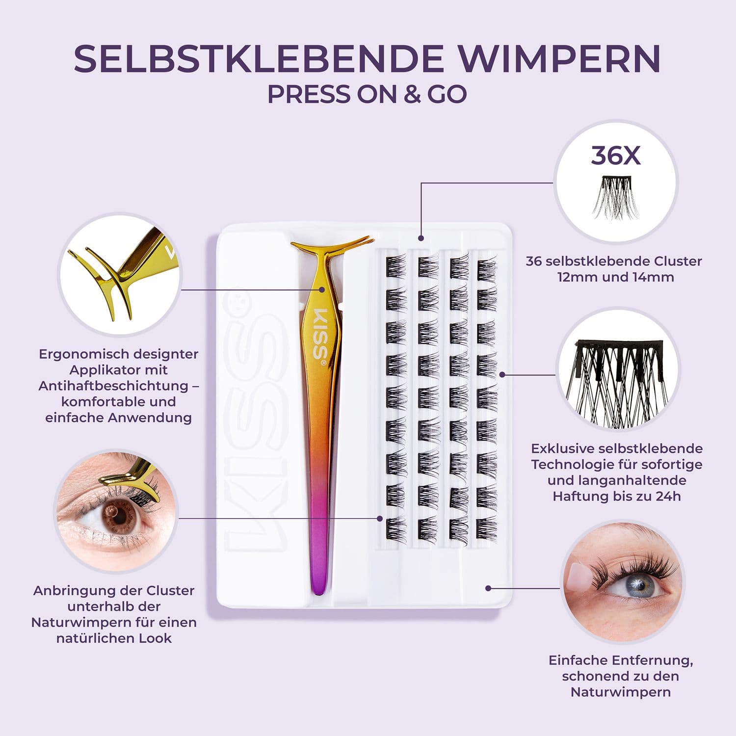 | Anwendungshinweis | 1. Nehme ein Wimpern Cluster aus der Verpackung. 2. Platziere das Cluster unterhalb der natürlichen Wimpern. 3. Drücke das Cluster und die natürlichen Wimpern mit dem Applikator zusammen. ENTFERNUNG Entferne die Wimpern Cluster mit sauberen Händen, indem du sie vorsichtig abziehst, beginnend mit der Seite des Wimpernbandes. |